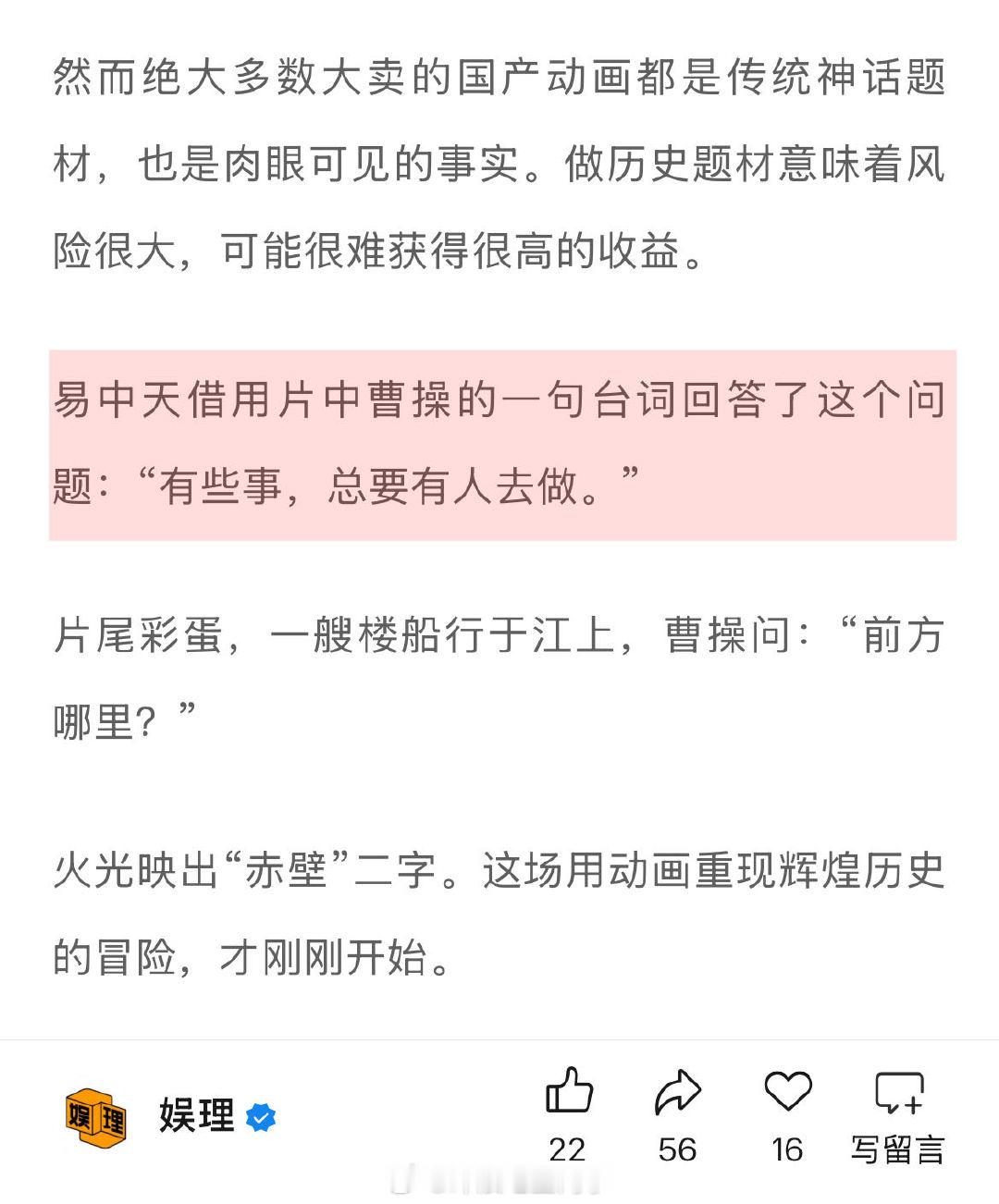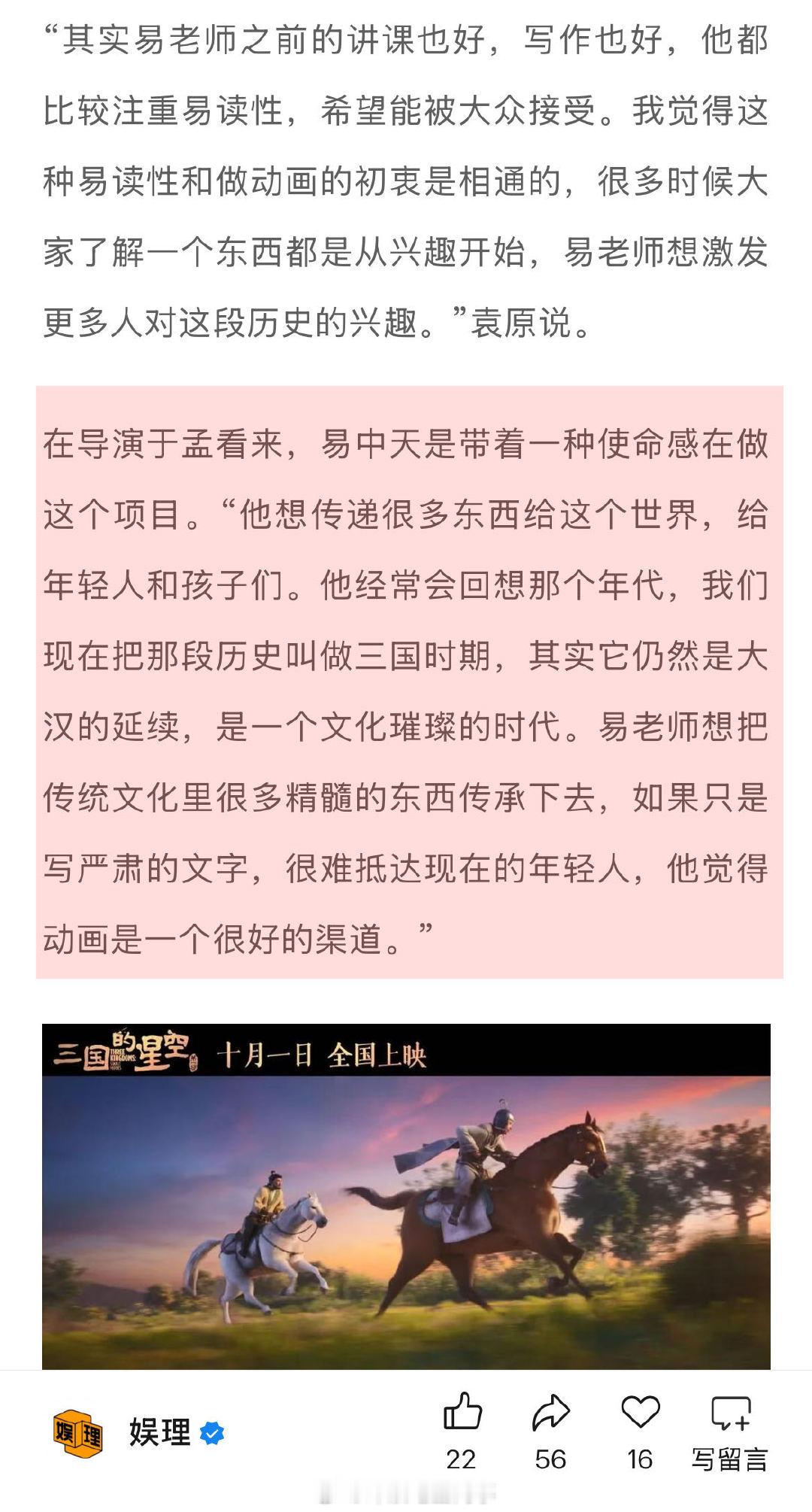 易中天说檀健次的声音就是曹操 78岁易中天回应为何想做动画三国 易中天回应用动画电影《三国的星空》实现三国梦: 第一是成本可控,真人电影光场景+服化道就是一笔巨资投入,没有几个亿成本不下来;第二是周期可控,动画电影的工艺流程相对明确,真人大片的周期可能会拉得很长;“第三个说老实话,就是动画角色不会塌房”…娱理独家↓
