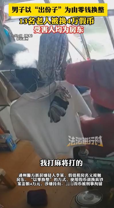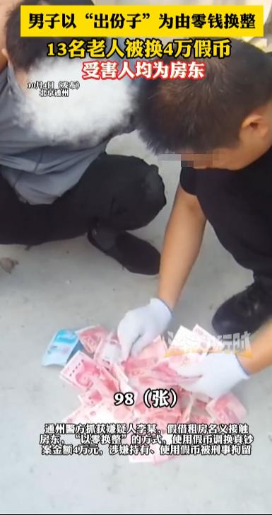 “防不胜防!”10月4日,北京通州,一男子以孩子结婚出份子钱为由,找到多名老人帮忙零钱换整,谁知男子的零钱竟是假币,13名老人被骗4万,网友:骗老人钱良心不会痛吗? 现在手机支付方便快捷,已经变成了年轻人的生活常态,收到假币的情况也少了,不过,一些老人还是习惯使用现金,一些犯罪分子也将歪主意打到这些老人身上。 一男子通过不法渠道获得了大量零钱假币,为了将这些假钱变成真钱,男子思来想去,觉得老人一般使用现金多一些,因为要收租,房东家中应该是有比较多现金的,于是他决定对一些老年房东下手。 男子假借租房名义,和多名老年房东进行接触,并且混了个脸熟,时常会和他们聊聊天,为自己日后“以假换真”铺好了路。 这天,男子敲响了这些老年房东的家门,称自己的孩子结婚,要随份子钱,向这些老人提出用零钱换整的请求,男子已经在这些老年房东面前刷足了存在感,他们对男子没有戒心,并且很多老人看到零钱不会往假钱那方面想。 对于男子的请求这些老人几乎全部同意了,其中有老人询问男子这么多零钱哪里来的,男子就回应是自己打麻将来的,老人觉得合理也没再继续说什么。 利用这些老人的信任,男子前前后后换出去4万假币,但纸是包不住火的,男子的恶劣行径还是被警察发现,将其逮捕,男子也带上了“银手镯”,为自己的贪念付出了惨痛的代价! 一定要提醒家里老人提防莫名其妙接近的人,一旦和钱扯上关系,要反复确认后再决定要不要掏出来! 信息来源:《男子以“出份子”为由零钱换整 13名老人被换4万假币 受害人均为房东》法治进行时