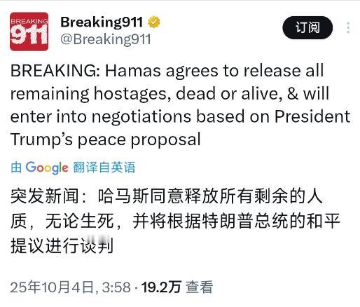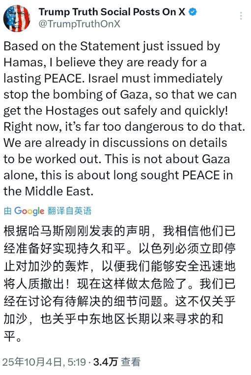 突发新闻:美国总统特朗普今天(北京时间10月4日)发文写道:“根据哈马斯刚刚发表的声明,我相信他们已经准备好实现持久和平。以色列必须立即停止对加沙的轰炸,以便我们能够安全迅速地将人质撤出!现在这样做太危险了。我们已经在讨论有待解决的细节问题。这不仅关乎加沙,也关乎中东地区长期以来寻求的和平。” 这波表态看似突然,实则是近半个月外交斡旋的集中爆发。早在9月底,特朗普就在白宫撮合了一场关键通话。 他逼着以色列总理内塔尼亚胡,给卡塔尔首相穆罕默德打去了道歉电话。内塔尼亚胡得为9月初空袭多哈的行为认错,还得为遇难的卡塔尔安全官员表达遗憾,承诺赔偿并保证不再犯。 那通电话被外界视作打破僵局的钥匙。卡塔尔一直是巴以冲突的重要调停人,以色列之前的空袭直接踩了卡塔尔划下的红线,让谈判彻底停滞。 特朗普显然算准了这步棋,他早两周就催着内塔尼亚胡道歉,觉得“一句简单的道歉往往能化解重重矛盾”。事实也确实如此,卡塔尔首相随后就松了口,说欢迎以色列的保证,愿意继续为地区稳定出力。 紧接着,特朗普的“20点计划”就摆上了台面。这个计划内容很细,要求哈马斯在以色列接受计划72小时内释放所有扣押人员,不管是活人还是遗体。 作为交换,以色列要释放250名无期徒刑囚犯,还有1700名2023年10月7日后拘留的加沙人。计划甚至提到,愿意解除武装并承诺和平的哈马斯成员能获得赦免,想离开加沙的还能走安全通道。 更值得注意的是,特朗普还打算牵头搞个“和平委员会”当过渡机构,自己亲自当主席,监督加沙战后治理,同时让以色列从加沙撤军停火。 这计划刚抛出来时,哈马斯的态度还很模糊。9月28日那会儿,他们还对外说没收到新提案,谈判因为多哈空袭的事陷在僵局里。 但仅仅几天过去,风向就变了。10月3日晚,哈马斯终于发了正式声明,给这场外交拉扯给出了回应。 他们原则上同意在“20点计划”的框架下释放所有以色列被扣押人员和遗体,还说愿意马上通过调解方谈细节。对于加沙的管理权,哈马斯也松了口,同意交给一个有民族共识、受阿拉伯国家支持的独立技术官僚机构。 当然,哈马斯也留了后手。声明里压根没提计划中让他们解除武装、推动加沙非军事化的内容,对以色列分阶段撤军的安排更是明确反对,他们一直要求的是立即全面撤军。 哈马斯这声明确实给了特朗普底气,才有了他10月4日那条要求停火的发文。但这场和平博弈里,各方的心思远比表面看起来复杂。 内塔尼亚胡的处境其实很拧巴。他9月底在白宫跟特朗普会面时,还说接受“20点计划”,称计划满足了以色列的军事目标。 可他心里清楚,停火撤军的承诺会激怒国内的极右翼盟友,已经给他带来了不小的政治压力。他还得公开说反对建立巴勒斯坦国,在外交妥协和国内政局之间走钢丝。 特朗普的算盘则打得更精。他一边给哈马斯下最后通牒,说不接受计划就等着“地狱之灾”,美国会全力支持以色列动武。 另一边转头就呼吁停火,把自己塑造成中东和平的“救世主”。他甚至还想拉卡塔尔加入《亚伯拉罕协议》,彻底打通以色列和阿拉伯世界的关系。 毕竟之前他还抛出过“美国长期接管加沙”的离谱想法,被沙特等国强烈反对,现在借着哈马斯的回应推进停火,无疑是更稳妥的加分项。 最微妙的还是阿拉伯世界的态度。卡塔尔松口调停是关键一步,但其他国家对特朗普的计划仍有疑虑。 哈马斯在声明里特意强调,加沙未来和巴勒斯坦人的权利问题,得按国际法和民族自决原则来,这话明显是说给阿拉伯盟友听的,怕被扣上“妥协退让”的帽子。 现在的中东局势,就像一盘下到中局的棋。特朗普的停火呼吁把各方都推到了台前,每一步都连着后续的连锁反应。 以色列会不会真的停炸?哈马斯释放人质的节奏如何把控?那些没谈拢的细节,比如撤军时间表、哈马斯武装处置等,能不能达成共识?这些问题都悬而未决。 但有一点很明确,这场由特朗普主导的外交大戏,已经让僵持许久的巴以冲突出现了新的变量。哈马斯的松口给了和平一丝机会,以色列的态度则成了接下来的关键。 如果停火真能实现,人质顺利撤出,那中东或许能迎来久违的喘息。要是各方仍各怀心思,这波看似积极的进展,说不定只是下一轮冲突的铺垫。毕竟,中东的和平从来都不是喊几句口号、发几条声明就能实现的。 信源:新华网《哈马斯回应美国“20点计划” 特朗普:立即停止轰炸》