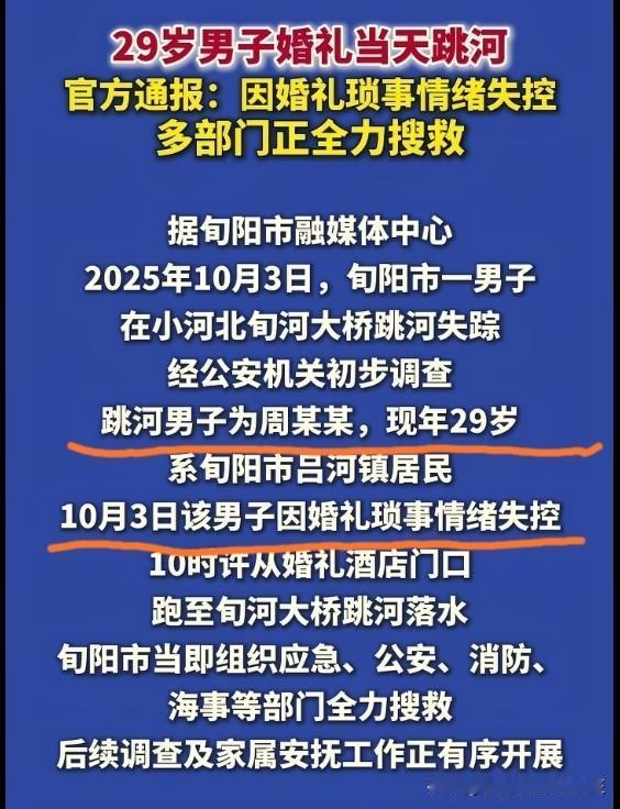 问世间,情为何物? 旬阳29岁新郎,因新娘临时要2万下车费跳河自尽。 本是人生喜事,即将步入婚姻殿堂,结果是新郎亲人哭断肠。 压死新郎的不仅仅是2万块钱,应该还有气急攻心的绝望。毕竟真正爱你的人,不会在这种时刻给你出一个这么大的难题。 人呐,结婚终身大事还是得门当户对,三观一致否则不是进入爱的殿堂是爱情的坟墓。
