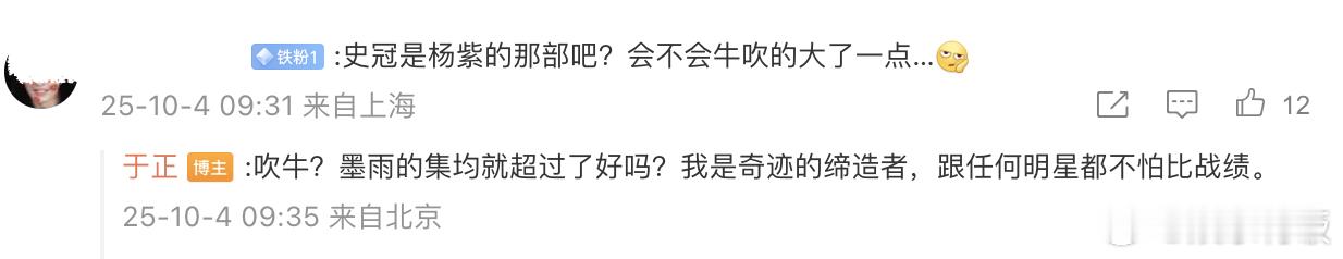 于正 我跟任何明星都不怕比战绩 发文谈长剧市场的未来,表示“事实证明,只要故事好,长剧市场依旧繁荣”,对于网友质疑于正的历史成绩,于正表示“我是奇迹的缔造者,跟任何明星都不怕比战绩。”