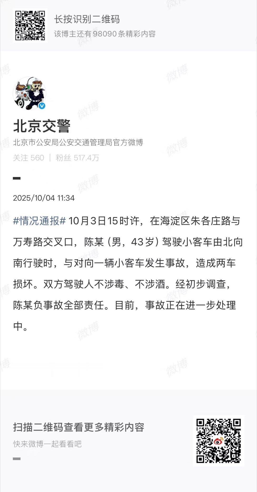 关于陈某的事故,北京交警通报来了陈某负事故全部责任,大过节的还是要安全至上啊[挖