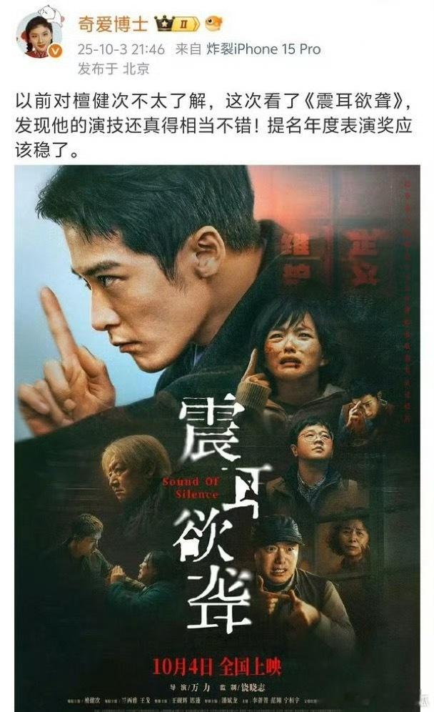 中国电影资料馆副处长、北影策展人夸赞檀健次《震耳欲聋》的表演:提名年度表演奖应该稳了!