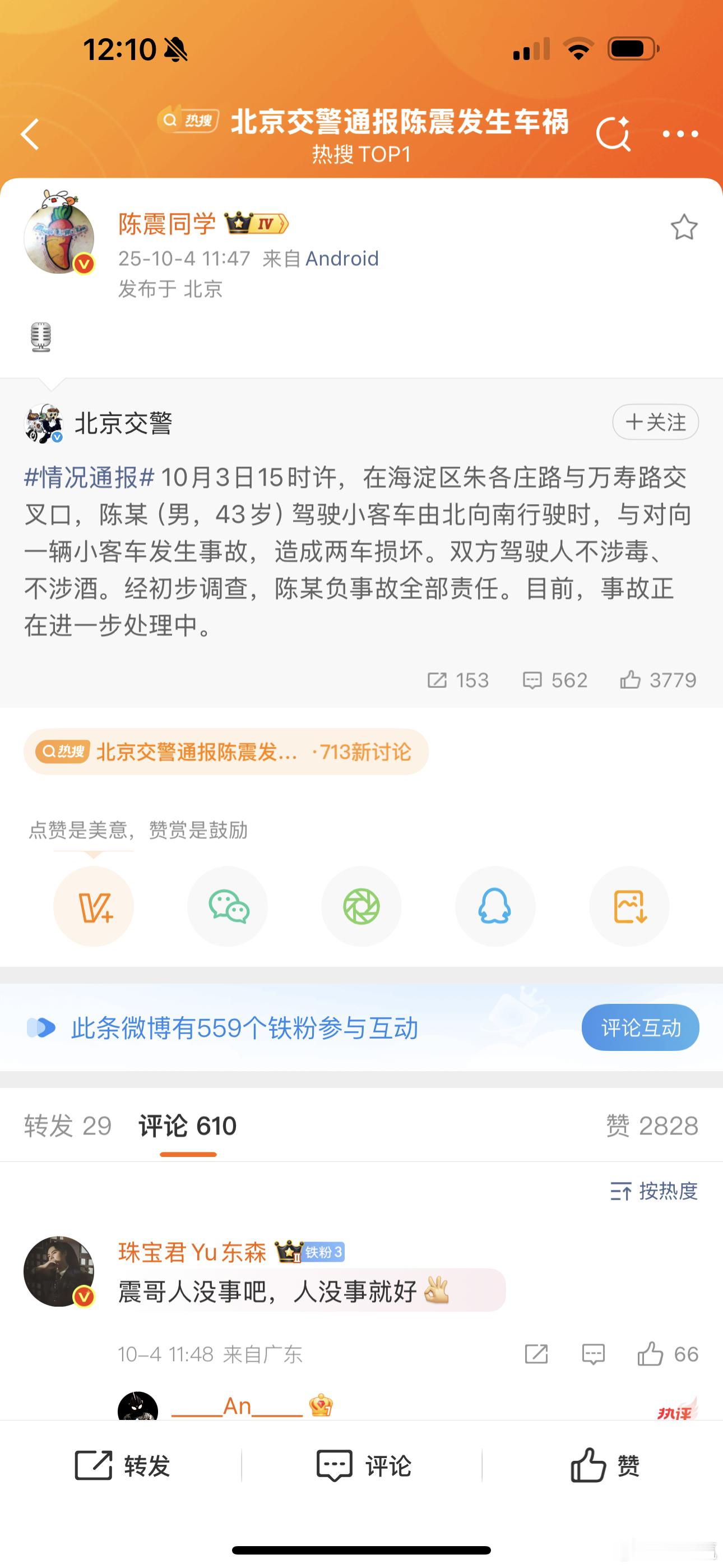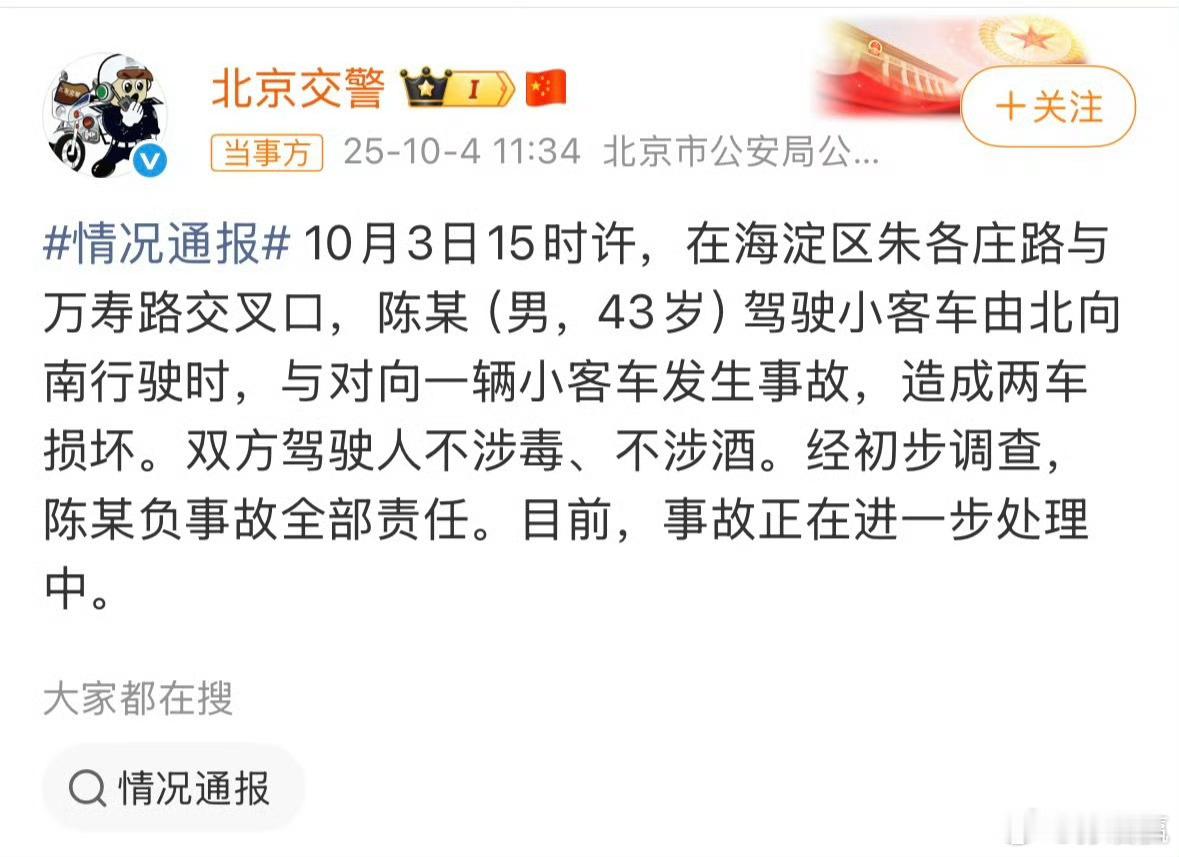 北京交警通报陈震发生车祸热闹了一天,官方公告终于来了,“不涉毒,不酒驾”“震哥全责”。