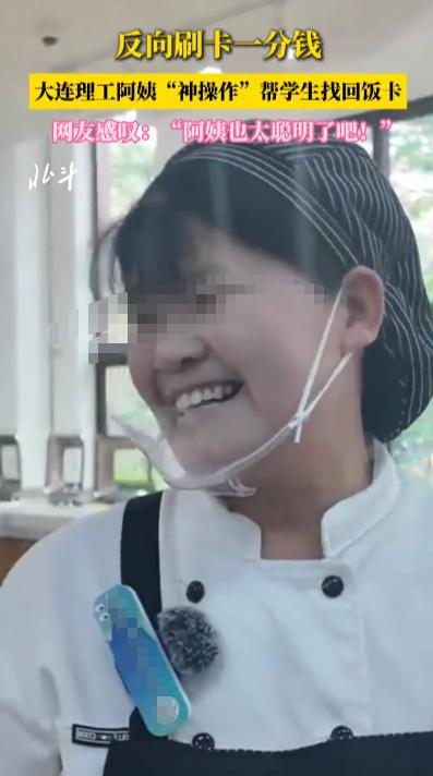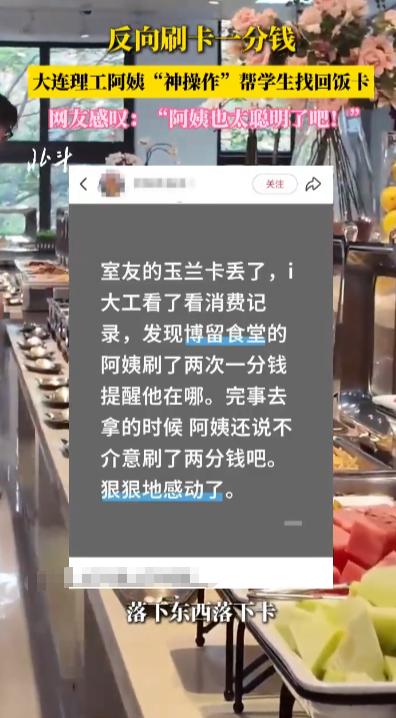 “人怎么能这么聪明!”2025年9月,辽宁大连,一大学食堂阿姨捡到了一张遗失的饭卡,担心丢失饭卡的同学着急,食堂阿姨拿饭卡在自己窗口刷了两次0.01元,巧妙告知饭卡的位置,网友:阿姨 也太聪明了吧! 读大学时,丢失饭卡是一件非常令人着急的事情,除去担心被人盗刷之外,补办饭卡也十分麻烦,不仅需要交额外的物料费,还得特地跑去办卡处,有时还需要辅导员开证明。 一大学的食堂阿姨捡到了一张遗失的饭卡,她担心丢卡的同学着急,想赶紧将饭卡送回到失主手中,可放在失物招领处又怕失主一时半会看不见,阿姨思考了一会,想到了一个“妙计”。 饭卡与手机上的应用是绑定的,虽然不能直接定位饭卡的位置,但是可以看到在哪个食堂窗口消费,阿姨将这张饭卡在自己的窗口刷了两次1分钱,这样失主就可以从手机上看到自己饭卡的消费记录。 丢失饭卡的大学生在看到自己饭卡消费记录后,立马前往这位食堂阿姨工作的窗口认领,阿姨将饭卡交到了失主手上,还为自己刷走2分钱道歉,这位大学生十分感动。 不少网友认为食堂阿姨很聪明,能想到这一点就十分不简单,这样做避免了饭卡被盗领,最快通知了失主饭卡的位置,为这位食堂阿姨点赞! 信息来源:《用1分钱做“暗号”的食堂阿姨火了:神操作帮学生找回饭卡》大象新闻
