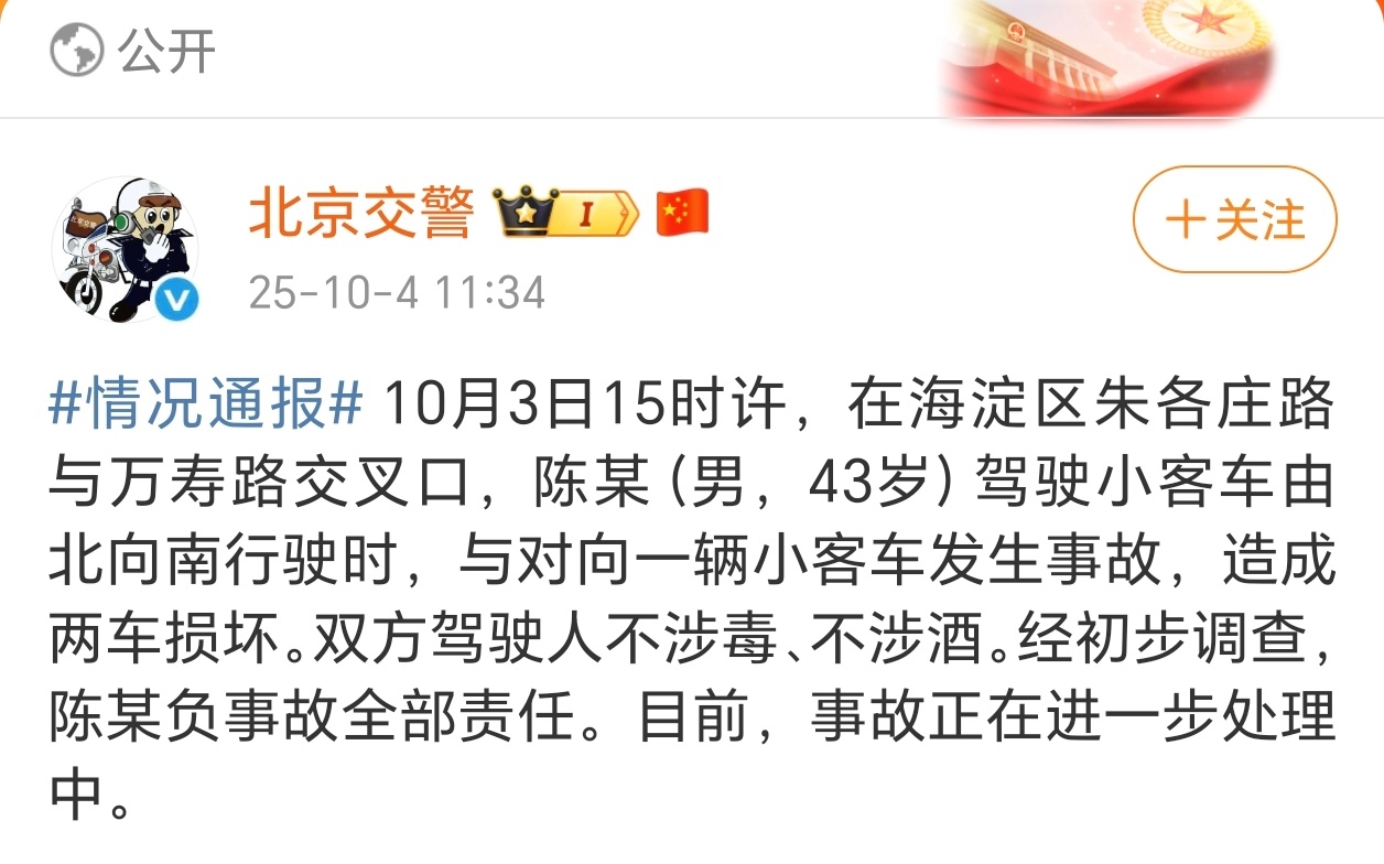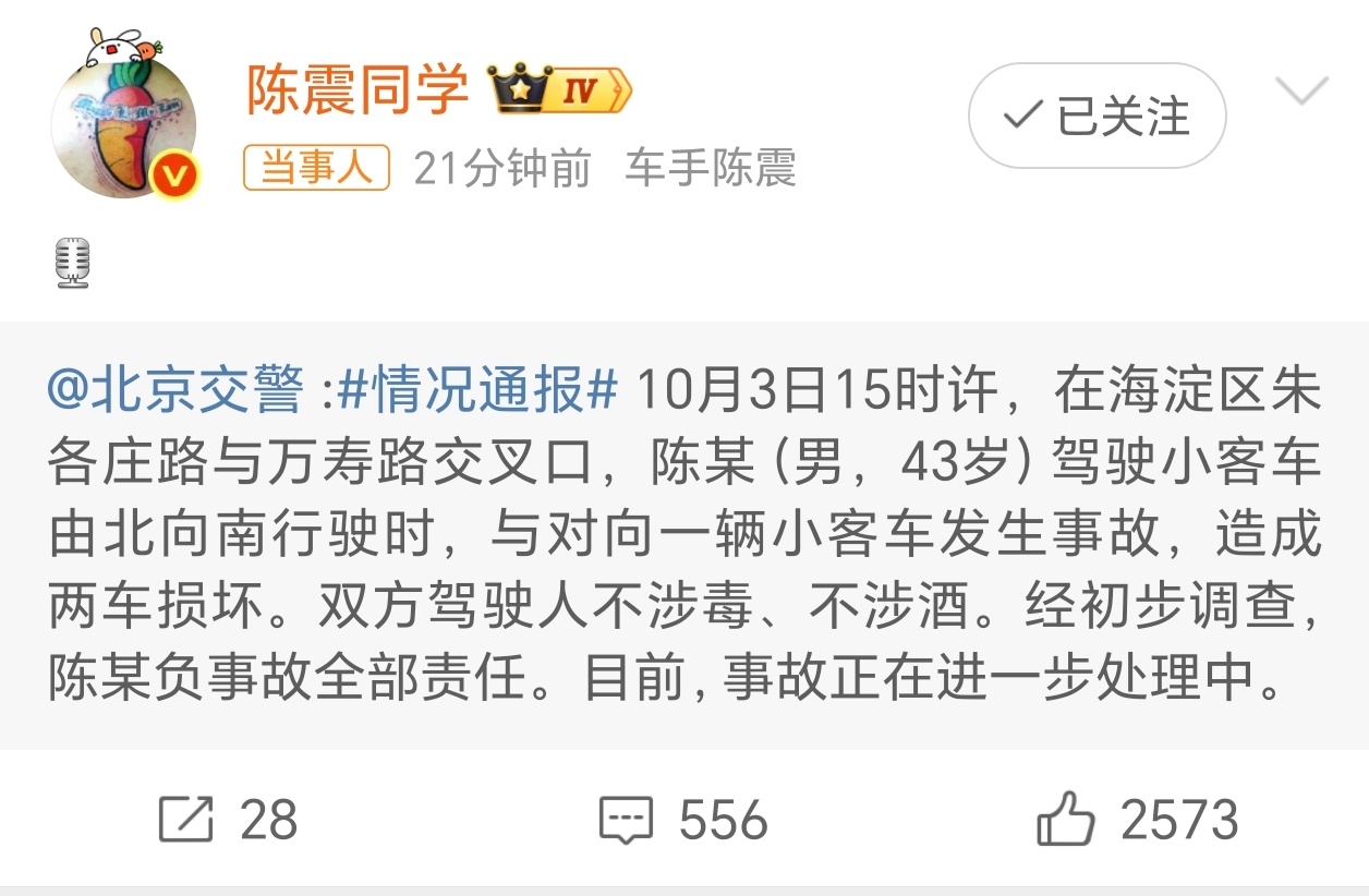 北京交警通报陈震发生车祸不涉毒、不涉酒,陈震负全部责任!