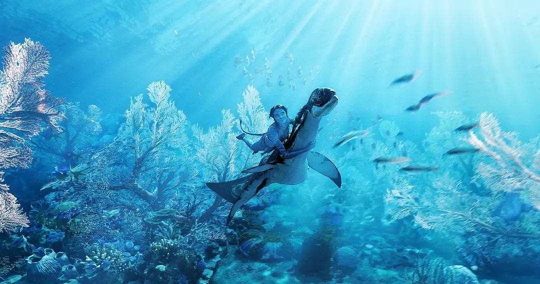 《阿凡达:水之道》在视听效果上比首作更加登峰造极,达到一种奇观-影像的极致,此前人类还从未在电影中创造出一个如此逼真细腻的虚构海洋世界——一个可信又自洽的幻想异域:能够与纳威人建立灵魂连接的水生坐骑伊鲁、凶猛无比的阿库拉鲨、驰骋海空的掠波翼龙,还有比鲸鱼更庞大的图鲲,以及海洋中千奇百怪的发光生物与五彩斑斓的珊瑚森林……唯有顶级的想象力与最强的特效技术相结合,才能呈现出此等华美瑰丽的视觉盛宴。