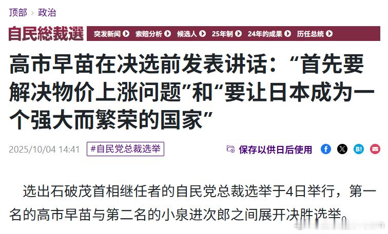 🔻高市早苗决选前的演讲:“首先要解决日本物价上涨问题”和“要让日本成为强大而繁荣的国家”