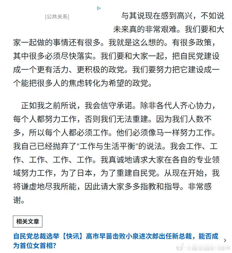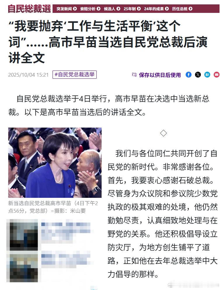 🔻高市早苗当选自民党总裁后的演讲:我会像马一样努力工作,我要抛弃“工作与生活平衡”这个说法,我会工作、工作、工作、工作。