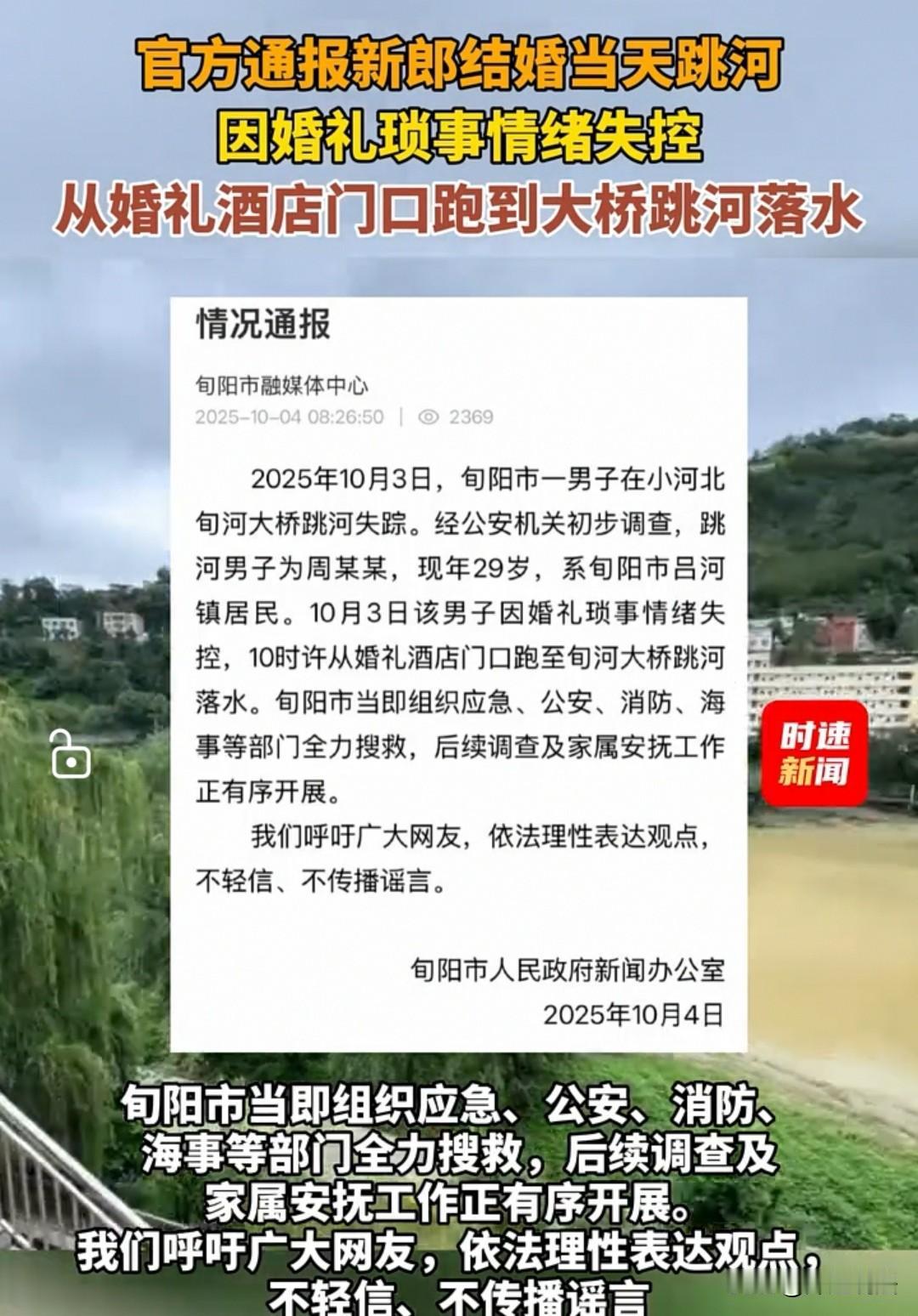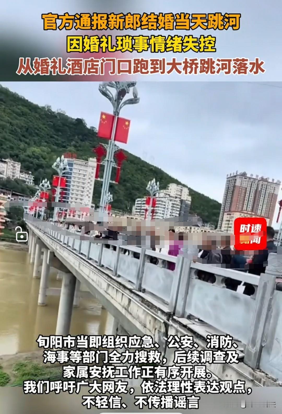 “29岁的新郎跳河了,真的太惋惜了。”旬阳,新郎的婚礼因为琐事在当天10点钟选择