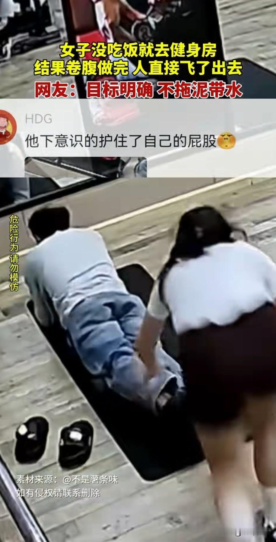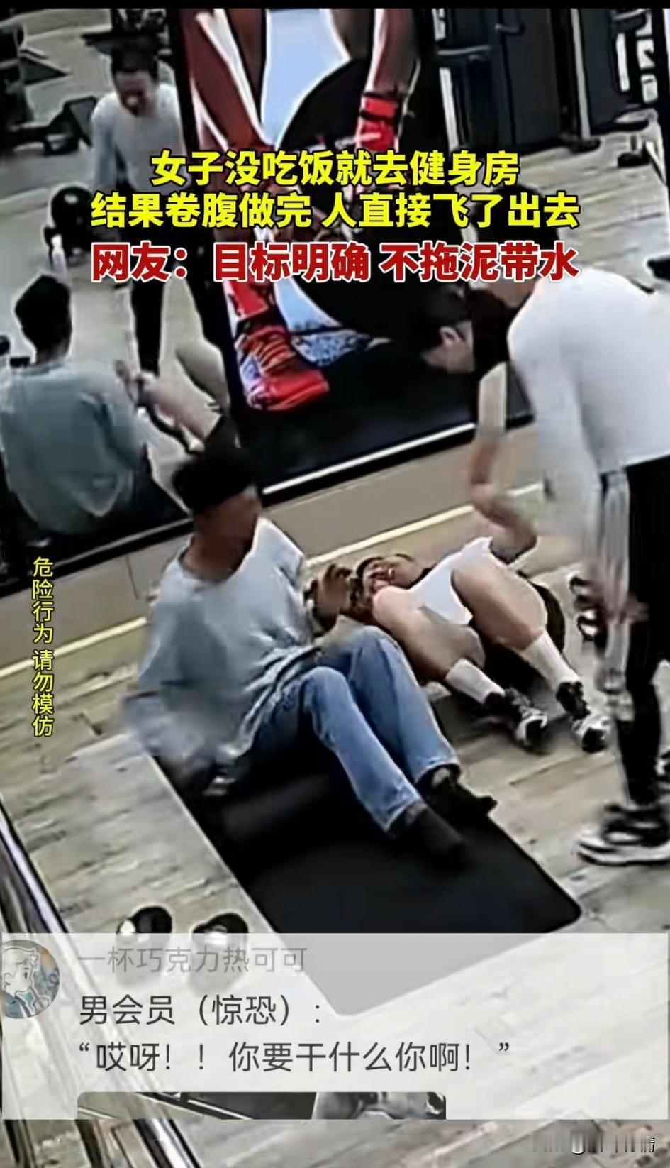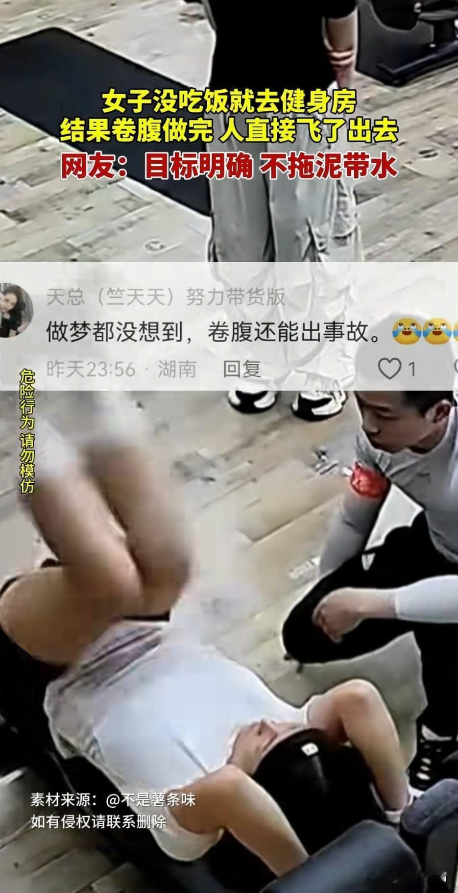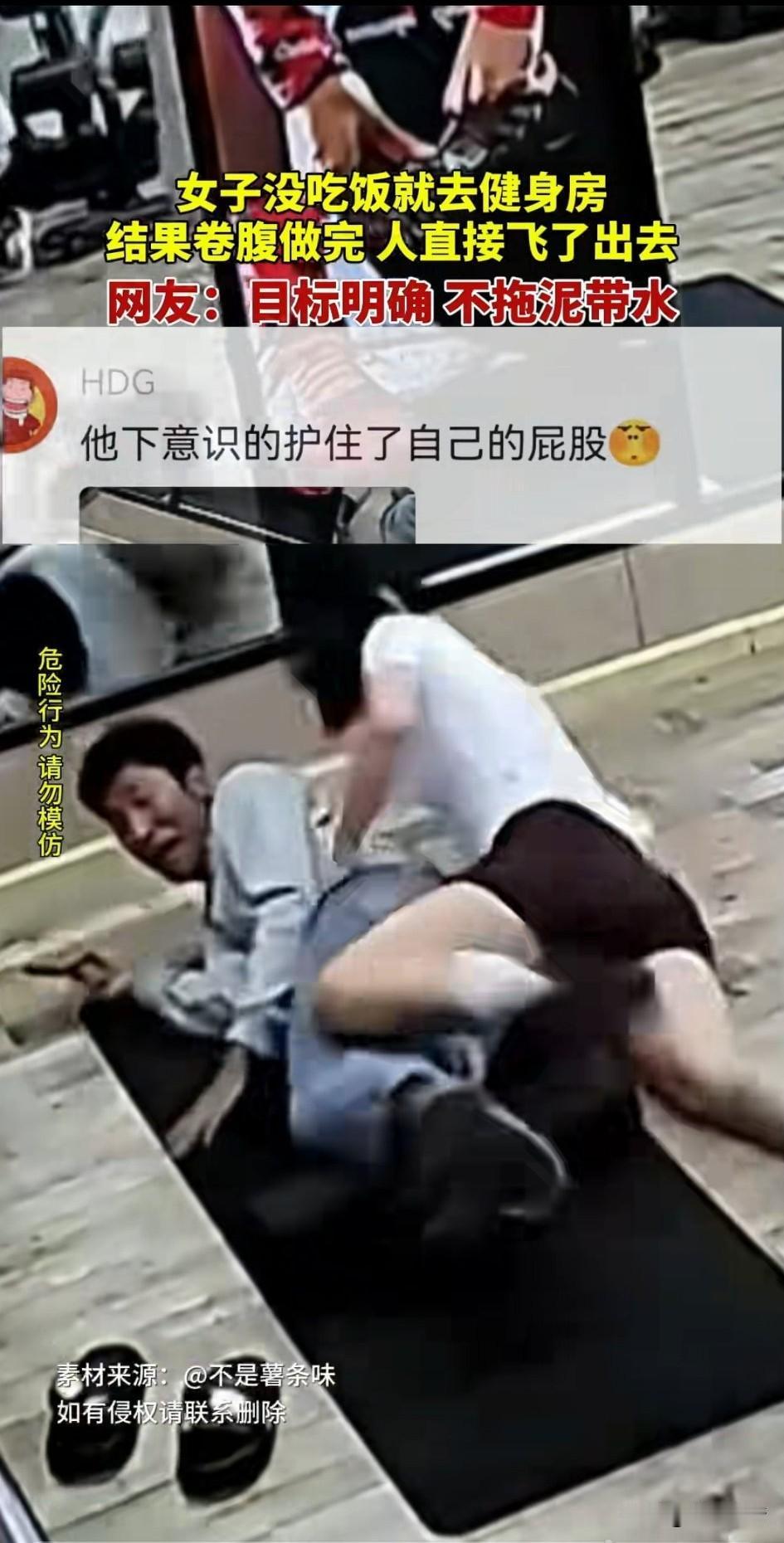 云南女子没有吃饭去健身房, 一位健身教练监督, 一位蹲下指导, 女子认真努力做了好多下卷腹, 她的前面男会员正在瑜伽垫上做俯卧撑,谁都没想到做个卷腹还能做出事故,只见女子猛然举起了双腿, 随后放下后人就飞出去了, 教练都蒙了从没有发生过这事, 女子直接冲向了在做俯卧撑的男子, 男子由于背对着她根本不知道发生了什么, 直到女子饿虎扑食, 压在了男会员身上, 男会员这才警觉, 表情惊恐背上压了一个女人, 大叫了起来:“哎呀你要什么?” 看得出来男会员被女子吓得不轻, 男会员一把将女子推了下去, 这便宜被女的占的, 这不是妥妥性骚扰吗? 健身房监控拍的清清楚楚, 性别一换不仅要赔钱还要关5天, 不是男女平等吗? 女子做完这事啥事没有? 还躺在地上哈哈大笑! 网友辣评大家对于女子卷腹飞出扑向目标明确不拖泥带水, 大家对于女子做卷腹人飞出这事怎么看? 天天健身 健身房那些身材 卷腹 卷腹力量训练 卷腹练习