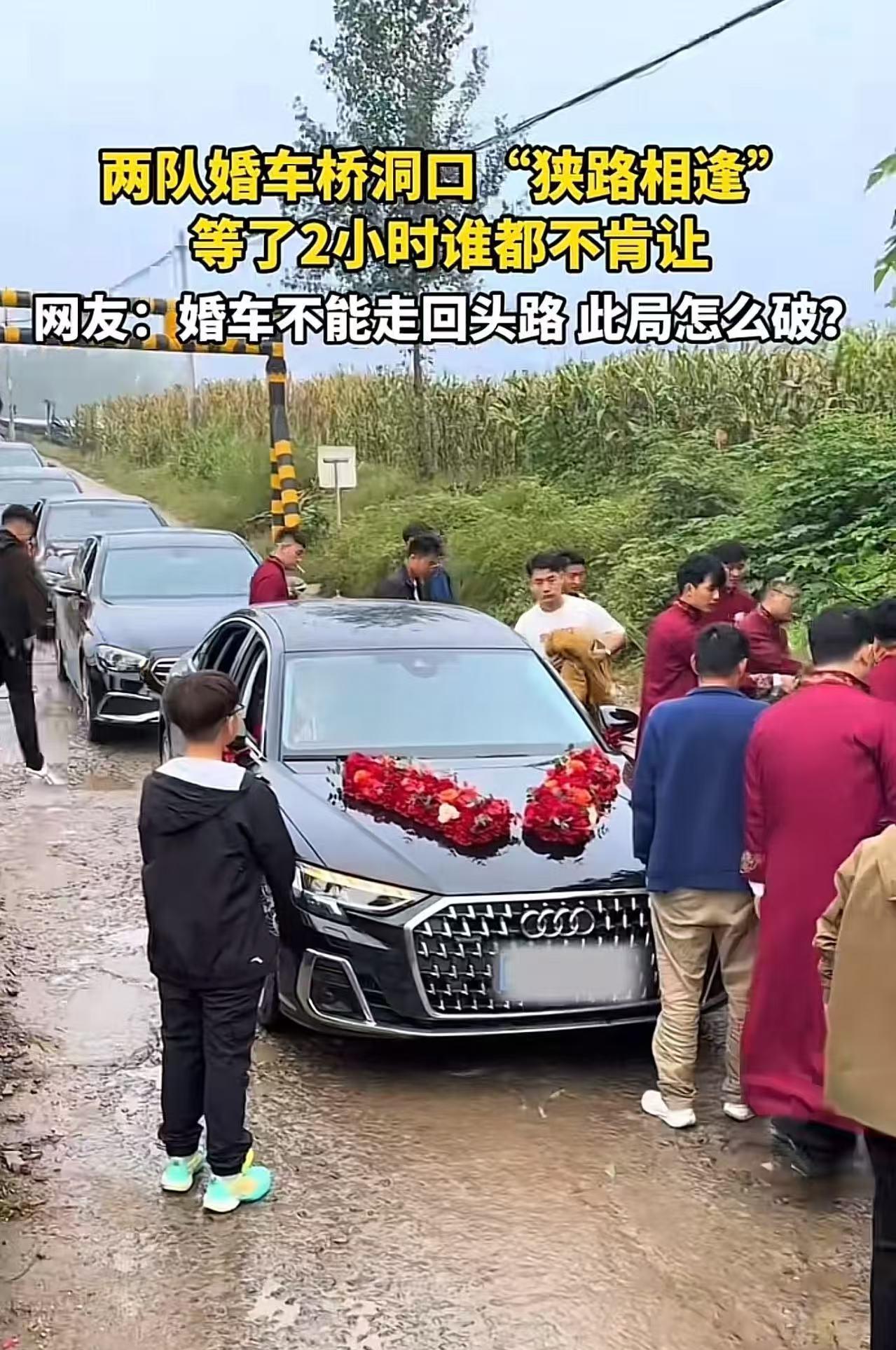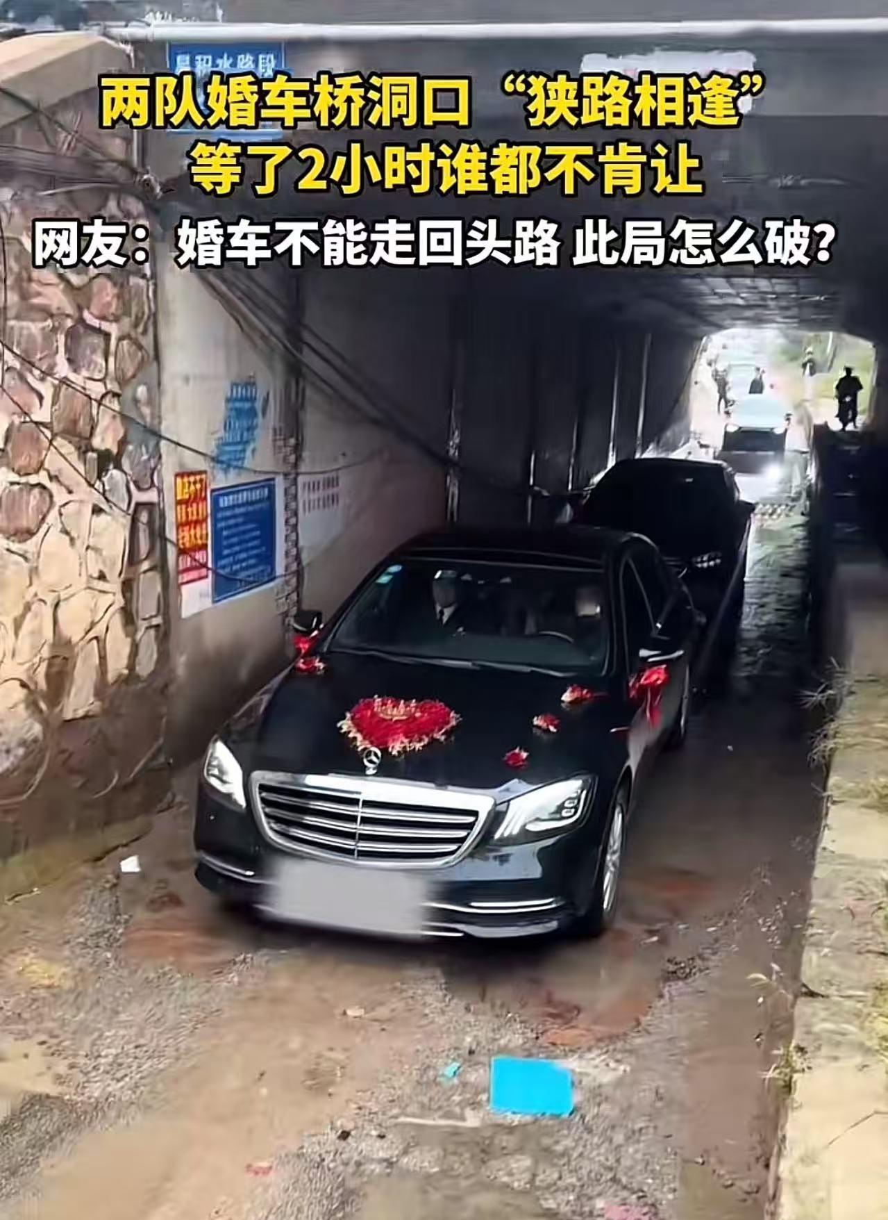 山东,两队婚车桥洞口“狭路相逢”,等了2小时谁都不肯让!网友:婚车不能走回头路,此局怎么破? 10月3日是个黄道吉日,喜事扎堆,结婚乔迁都选在了这一天!可是在一个狭窄的桥洞口,却上演了一场令人啼笑皆非的一幕! 这个桥洞空间有限,仅能容许一辆车缓缓通过。平日里,若是两车在此相遇,需要一方后退,为对方让出前行的道路。 可这一天情况却大不相同,按照当地的传统习俗,婚车一旦上路便不能走回头路,要是倒车了,就会被认为“不吉利”,会给新人的婚姻生活带来不好的影响。 于是,双方的新人都打定了主意,谁也不肯退车让路。 就这样,两队婚车在桥洞口僵持了起来,这一僵就是整整2个小时。 在这2个小时里,路被堵得严严实实,后面的车辆排起了长龙,喇叭声此起彼伏,可就是没人能打破这个“死局”。 此事引发了热议,有网友说,很多人理解错了吧?不是车不能回头,是人不能回头而已,这事不就好办了?双方交换红包,人下车走过去,车调好接着走,该上车就上车。 也有网友说,简单的不能再简单了!双方新人下车交换礼物!两方相互换车!双方倒车退出道路这叫幸福“倒”家! 还有网友说,如果说报警处理的话,一般都是没有进涵洞的给进涵洞的车让路。大喜的日子,双方各让一步。进入涵洞的婚车的人,拿着两条烟给没有进入涵洞的车辆分分。没有进入涵洞的车队就会给让开一条道路。互相都僵持不下,谁也走不了。 在我看来,这原本是双喜临门的好事,两队婚车相遇本应是“喜上加喜”,却因为所谓的习俗而互不相让,最后闹得个路堵心也堵,实在是得不偿失。 所谓的婚车不走回头路,这不过是一种没有科学依据的迷信说法罢了。婚姻的幸福与否,怎么可能取决于婚车是否倒车呢? 相反,我觉得在这个时候,哪辆车愿意主动让行,哪对夫妻或许更能相扶到老。因为主动让行体现的是一种格局,是一种愿意懂得忍让的品质。 在婚姻生活中,难免会遇到各种各样的矛盾和分歧,如果双方都能像让车的这一方一样,多一些包容和理解,少一些斤斤计较,那么婚姻生活自然会更加和谐美满。 而那些死活不肯让车的夫妻,或许在未来的日子里,会因为一些鸡毛蒜皮的小事就争得面红耳赤,互不相让。 我们不能让这些没有道理的习俗束缚了我们的行为和思维,在面对类似的情况时,应该多一些理性和智慧,少一些盲目和固执。 毕竟,真正的幸福是靠夫妻双方共同努力经营出来的,而不是靠一些虚无缥缈的习俗来保佑的。