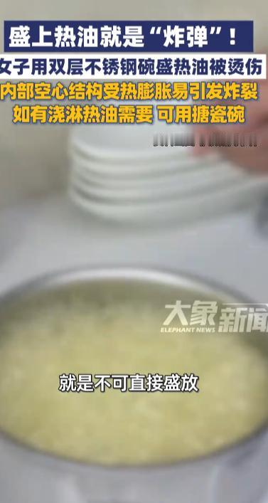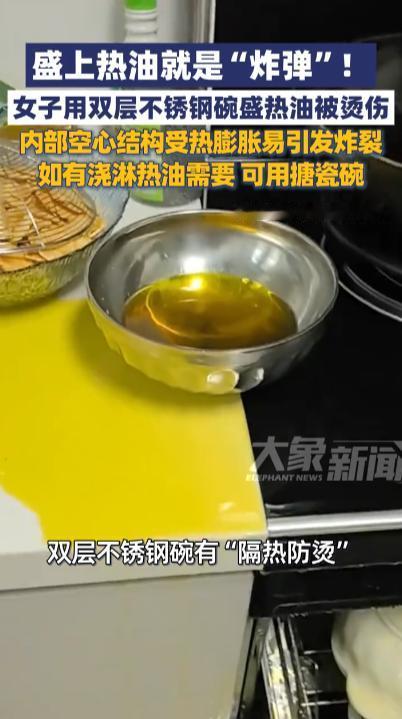 “悲剧还是发生了!”2025年10月,湖北恩施,一女子在做饭时用不锈钢碗盛装热油,结果碗体忽然炸裂,热油到处飞溅,女子身上被严重烫伤,网友:这哪里是碗啊,这不就是一炸弹吗! 中秋将至,家人团聚,大家围坐在圆桌前吃一顿丰盛的团圆饭,享受团圆的喜悦,家中厨房开始忙碌起来,可厨房中存在着一些安全隐患,这时更要注意起来! 一女子准备在烧好的菜上泼点热油增香,她顺手拿过旁边的一个不锈钢碗,将锅中滚烫的热油倒进里面,女子刚想伸手拿碗,只见面前的不锈钢碗忽然裂开,里面的热油噼里啪啦四处飞溅,有不少都溅到了她的身上。 被热油溅到的女子尖叫出声,身上多处严重烫伤,她不明白好好的碗为什么就炸了,不锈钢碗按理来说应该是比较坚固耐用的,为什么会出现这种事故呢? 市面上大多不锈钢碗都有一定的“保温隔热”的作用,这种双层不锈钢碗是空心结构,热胀冷缩大家都知道,承装滚烫的热油后,内部的气体受热膨胀,到达碗的极限后自然就会炸开。 我们在做饭时如果需要泼油增香,那么盛装的热油的容器可得选好了,千万不能使用这种不锈钢碗,悲剧一旦发生就不可挽回! 信息来源:《注意啦!许多家庭厨房都有的这种碗,盛上热油就是“炸弹”!》上观新闻