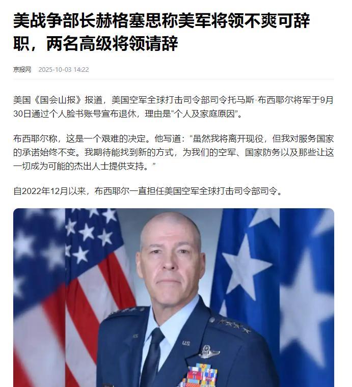 最近美军高层挺乱的,好几个大官都连着 “退休”,看着像是自己想走,其实不少是被逼的。 比如 8 月底的空军参谋长奥尔文,他的任期才过一半就退了,《华盛顿邮报》直接说,就是赫格塞思逼他走的。 到了 10 月初,又一个空军上将比西尔也提了退休,这人手里管着核力量,理由还是老一套的 “家里有事”,跟奥尔文的说法没两样。 这事儿的根子,得从 9 月 30 号赫格塞思开的那个会说起。他把近千个将领叫到基地,连个正经议程都没有,一上来就骂:“五角大楼里那些胖将军、留胡子的‘邋遢鬼’,绝对不能有!” 还放了狠话:“要是听我这话觉得不舒服,就体面点辞职!” 当场就定了规矩,作战岗位的体能得按男兵最高标准考,不够分就走人,还说要裁掉五分之一的将官。 明眼人都能看出来,查体重、管胡子都是幌子,其实就是想清掉不听他话的人,安插自己信得过的人。 他为啥要这么折腾?核心是想推自己的国防战略:让美军别在海外耗着,回本土搞防御,还要从欧洲、非洲撤兵。可军方一直想搞 “大国竞争”,俩思路根本对不上。 连北约盟友都不乐意,现在俄罗斯还在跟乌克兰打仗,欧洲正需要美军帮忙呢,这时候撤兵算怎么回事。 更让人觉得可笑的是他还双标:自己刚把国防部改名叫 “战争部”,裁人的时候还特意多裁女将官,民主党都骂他,说他是把党派那套东西塞进军营,把军队的专业性都毁了。 其实最关键的一点是:军队不是公司,选官不能只看听不听话。那些退下来的老将,都是干了几十年的人,懂打仗、熟业务,他们一走,新人根本顶不上来。 现在美军自己内部吵成一锅粥,盟友也不放心,再喊 “世界最强” 的口号,听着就虚。 这么折腾下去,不光美军的战斗力要打折扣,连它在全球的信誉都得掉价,毕竟一支连内部共识都没有的军队,就算口号喊得再硬,也撑不起场面。
