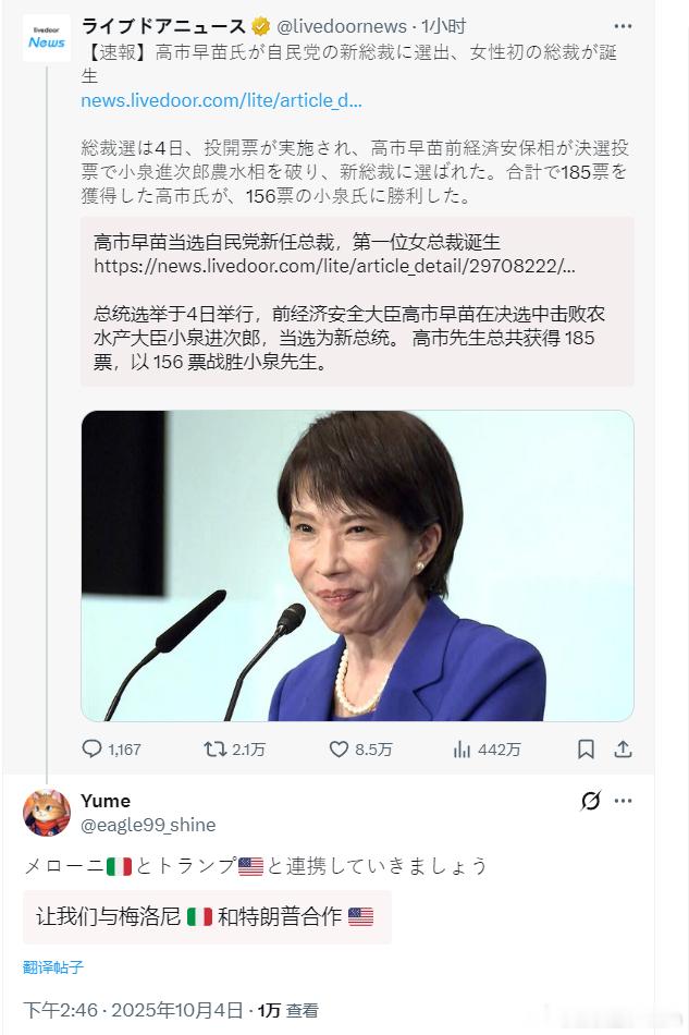 🔻有日本网民在高市早苗当选的新闻评论区表示:让我们与意大利🇮🇹的梅洛尼、美国🇺🇸的特朗普合作。[哆啦A梦吃惊][哆啦A梦吃惊]