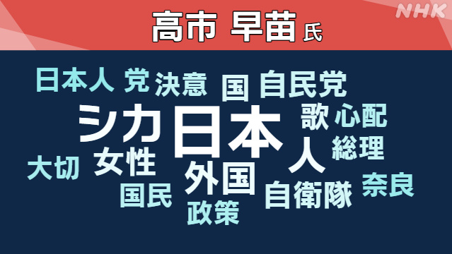 日本广播协会(NHK)发现,在9月22日的首场竞选演讲中,高市在阐述“与外国人和外国资本打交道”政策上花费的时间最多,占比达43%,并承诺“将献出生命来保护日本的古老传统”。在演讲中,她的高频词汇为“日本”,出现了16次。