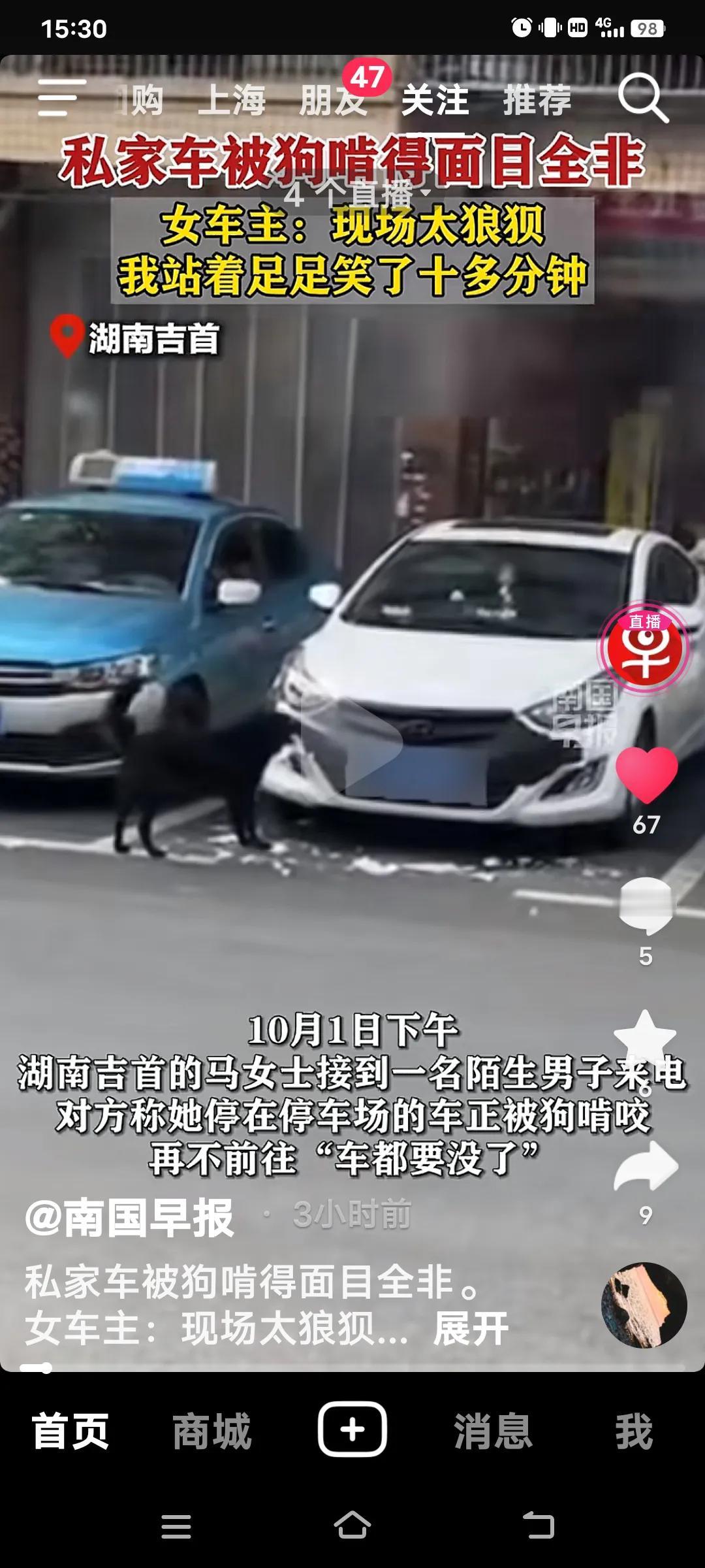 真是可笑机智,10月1日下午,湖南吉首的马女士睡得正香,被一通陌生电话吵醒,说她的车正被狗啃,再不去车就没有了。她半信半疑赶到停车场,眼前场景让她惊呆了。 马女士看到自己的白色私家车,车头多处被狗撕的一片狼藉,爱车保险杠被撕成条,车身满是牙印和口水,肇事黑狗还在一旁溜达。马女士站在那竟笑了足足10分钟。 等她想拍照取证,黑狗跑没影了。车辆损失得小千元,能不换就不换了。10月人3日辖区工作人员到现场看过,目前,肇事狗还没有找到!真是千算万算想不到狗会撕车呀? 莫非车有异味?加那种“车衣”干嘛呢?这下是钱白花了,再说,你都没有拍照片。就是再遇到那只狗在你身边你也难认的得出来,只有自认倒霉吧!