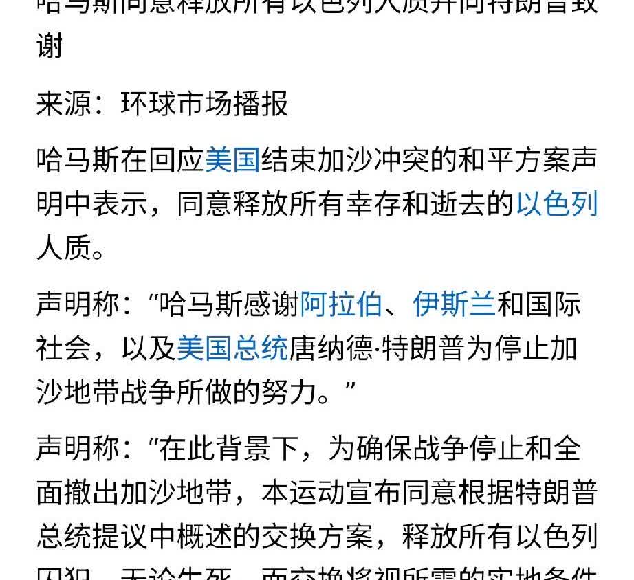 由拒绝到接受,哈马斯不到一天就彻底变了? 10月3日,哈马斯军事委员会成员哈达德回应美国总统特朗普提出的“20点计划”时表示不能接受,认为这是解除哈马斯武装的行为,他们会继续与以色列战斗下去。 但是,在埃及外长和卡塔尔、土耳其的合作游说之下,哈马斯政治局当天又表示同意计划并向特朗普致谢! 哈马斯的转变确实有点快,这等于还是在美国72小时的最后通牒期内怂了,因为一旦错过,美国将全力支持以色列恢复在加沙的军事行动,所以哈马斯此次声明称“在此背景下,为确保战争停止和以军全面撤出加沙地带……同意交换方案”。 不过,这也许是哈马斯采取的战术性安排,可以避免以军的军事行动,毕竟答应交换人质还需要一些时间上的准备,由此能为其争取更多时间来应对。但有一点是明确的,那就是巴勒斯坦民族权力机构及其他阿拉伯国家此次都同意了美方的计划,再加上越来越多的国家承认巴勒斯坦国,这是哈马斯不能违逆的大趋势。 聊热点