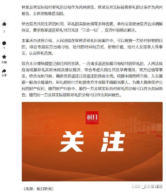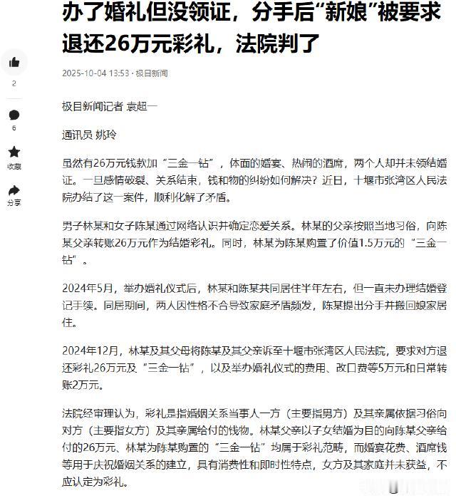 湖北十堰,林某和陈某网恋确定恋爱关系后定亲,林某父亲转26万彩礼,林某买1.5万“三金一钻”。2024年5月两人办婚礼但未领证,半年后因性格不合分手。林某一家起诉要求退彩礼等费用,最终调解让陈某退18万及“三金一钻”。 素材来源于:2025-10-04 13:53·极目新闻 林某和陈某本是在网络偶然相遇的两个人,可一次次热络的聊天,让他们很快擦出了爱情的火花,迅速确定了恋爱关系。随着感情升温,两家开始商议定亲事宜。 林某父亲满心欢喜,觉得儿子找到了好归宿,便按照当地习俗,郑重其事地给陈某父亲转了26万当作彩礼。 林某更是用心,他跑了好几家珠宝店,精心为陈某挑选了价值1.5万的“三金一钻”,金项链在灯光下闪烁着光芒,金戒指精致小巧,金耳环摇曳生姿,钻石更是璀璨夺目,林某满心期待着能和陈某携手走过一生。 2024年5月,阳光明媚,林某和陈某的婚礼热热闹闹地举行了。婚礼现场布置得美轮美奂,亲朋好友纷纷到场祝贺,大家都以为这对新人会一直幸福下去。然而,让人意外的是,他们一直没有去领结婚证。 同居的日子里,刚开始两人还如胶似漆,可时间一长,各种矛盾就逐渐浮现出来。 林某喜欢安静,下班后就想窝在家里看看书、打打游戏,而陈某则喜欢热闹,经常拉着林某去参加各种聚会。 在生活习惯上,两人也差异很大,林某比较节俭,陈某却花钱有些大手大脚。 这些小矛盾不断积累,终于在半年后爆发了。那天,两人又因为一件小事吵了起来,越吵越激烈,陈某实在受不了这样的生活,一气之下收拾东西搬回了娘家,还提出了分手。 林某和父母一下子慌了神,他们觉得为了这场婚礼,家里花了那么多钱,现在说分手就分手,这彩礼、“三金一钻”,还有婚礼费、改口费等7万块不能就这么打了水漂。 2024年12月,林某和父母经过一番商量,决定起诉陈某和她父亲。林某一家要求陈某一家退还所有费用。 陈某觉得自己在这段感情里也付出了真心,现在分手也不是她一个人的错,不应该退还这么多钱。 承办法官并没有急着下判决,而是耐心地了解双方的情况,分别做他们的思想工作。 法官告诉林某一家,虽然陈某提出分手,但也不能完全不考虑陈某在这段感情中的付出。也劝陈某,毕竟收了彩礼和“三金一钻”,从情理和法律的角度,都应该适当退还一部分。 那么,这件事用法律该如何看呢? 彩礼返还问题,主要依据《民法典》婚姻家庭编的相关规定。 民法典第一千零四十二条规定,禁止借婚姻索取财物。这里的彩礼返还并非基于借婚姻索取财物这一违法情形,而是针对双方未办理结婚登记手续的情况。 当双方未办理结婚登记手续时,按照民间习俗给付的彩礼,给付方有权请求返还。这是彩礼返还的一般构成要件。 林某和陈某虽然举办了婚礼,但并未办理结婚登记手续,从法律形式要件上看,符合彩礼返还的请求条件。 不过,法律在规定彩礼返还时,并非一刀切地要求全部返还。 民法典及相关司法解释也考虑到实际情况中的复杂因素,比如双方共同生活的时间长短、是否生育子女、彩礼的使用情况、双方的经济状况以及导致感情破裂的过错等因素。 林某和陈某共同生活了半年时间,在这期间,双方共同经历了生活的点点滴滴,虽然最终因性格不合分手,但陈某在感情和生活中也有一定的付出。所以,不能简单地要求陈某全额返还彩礼。 经过法官多次耐心的调解,双方的态度终于有所缓和。最后,陈某答应退还18万彩礼,这个金额占林某父亲所转彩礼26万的约69.23%,还退还了“三金一钻”。 此次调解让陈某退还18万彩礼,占林某父亲所转彩礼 26 万的约 69.23%,同时还退还了“三金一钻”。 从彩礼返还比例来看,69.23%的返还比例,考虑了林某一家为结婚支付了较大金额的彩礼的事实,对陈某在共同生活期间的付出,也有一定的认可。 虽然双方未办理结婚登记,但共同生活半年,陈某在生活上必然有一定的投入和情感付出,所以适当扣除一部分彩礼作为对其付出的补偿是合理的。 对于“三金一钻”,由于其属于以结婚为目的的赠与财物,在双方未达成结婚目的的情况下,陈某应当予以返还。 此次调解结果为:陈某退还18万彩礼(约占69.23%)及“三金一钻”,有效平衡了双方的利益。 只是,这段曾经被寄予厚望的感情,最终却以这样的方式收场,实在让人唏嘘不已。您对这件事有什么看法呢?
