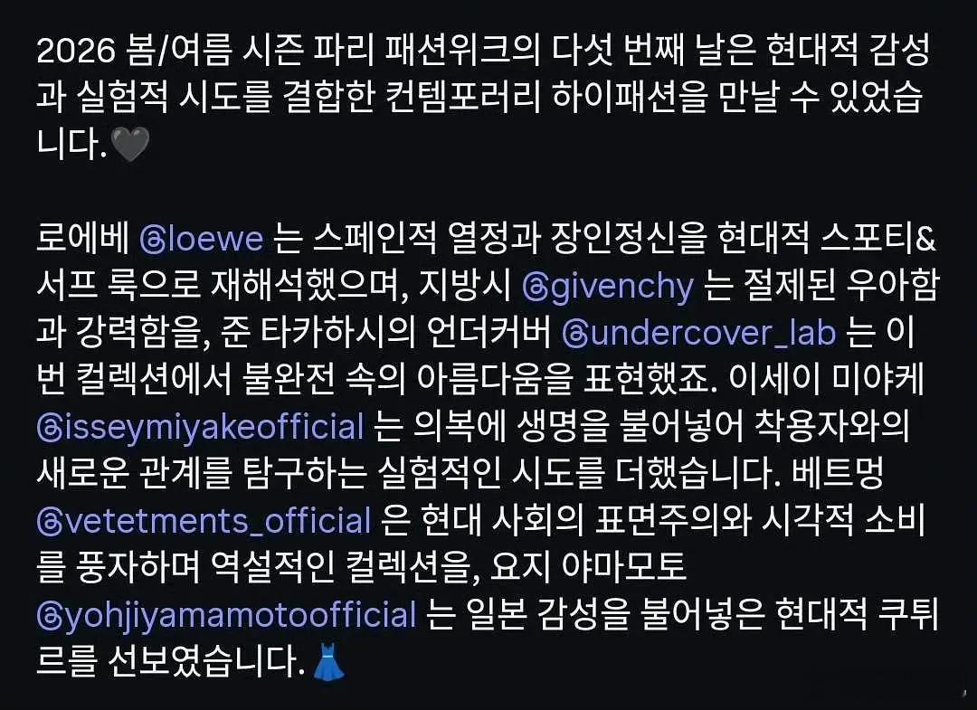 韩国娱乐时尚杂志发布ins博文总结2026年春夏巴黎时装周的第五天:呈现了一场融合当代感性与实验性视角的高级时装品牌大秀。