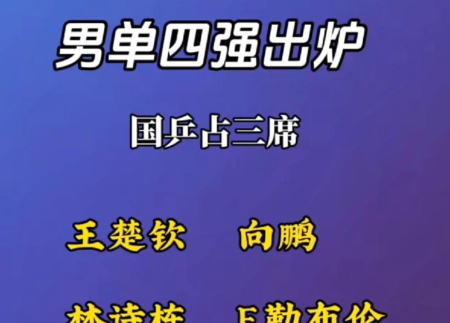 北京大满贯男单四强出炉, 国乒占据了三个席位。 国乒还是那个国乒, 只是时间问题。 随着向鹏4:3雨果, 王楚钦4:1松岛辉空, 北京大满贯男单四强诞生。 上半区王楚钦对战向鹏, 下半区林诗栋对战小勒布伦。 男单四强国乒有三个人, 这估计是最近男队人最齐的一次了。 上半区是队内之战, 谁赢都可以。 主要是下半区林诗栋对战小勒布伦, 考验小石头的时候到了, 小石头加油干, 一定要跟自己的兄弟成功会师。 国乒还是那个国乒, 请给他们点时间, 让国乒重回巅峰状态。 (图片源自于网络)