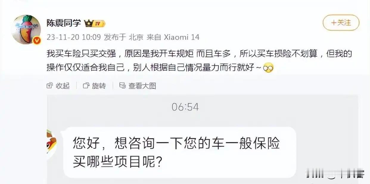 陈震的买车不买商业险仅仅适用于他自己,普通人老老实实的买就对了,要不然让你吃不了兜着走! 商业险里面最重要的就是车损和第三者,只要你在马路上行驶,谁也不敢保证你永远不出事故,小事故没商业险花点小钱无所谓,大事故花的可就不是小钱了,车毁了还好,如果人员重伤这可是一大笔钱 你如果像陈震一样有兜底的能力,你也可以不买商业险,你身家有多少?你身家没有三者的额度就没有兜底的能力,关键现在的商业险普通油车也花不了多少钱,电动车确实费用高一些,但是更要买,因为维修成本更高 还有自然灾害,火烧,水淹,还有盗抢,这都能降低你的损失,而且是大损失,一台10万的卡罗拉没有三者撞到劳斯莱斯知道意味什么嘛?意味你这辈子都没有翻身的机会了(普通人)车损保险 汽车商业保险