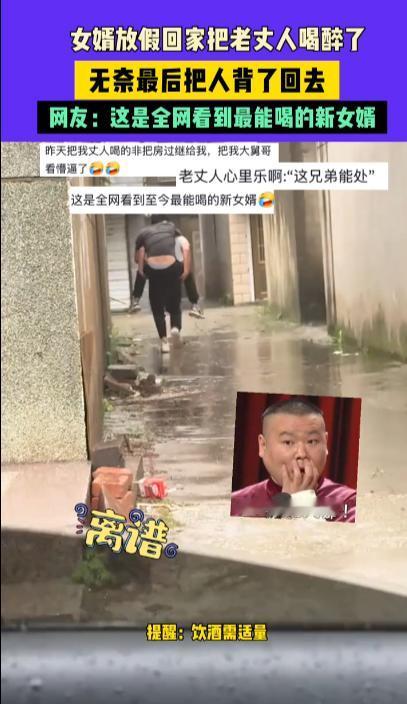 “电视都不敢这么演!”10月3日,江苏,一男子放假去妻子娘家做客,没想到饭桌上他竟然把老丈人给喝“趴下”了,老丈人醉的走路东倒西歪,无奈之下男子只好将他背回了家,网友:这是我见过最能喝的新女婿! 新女婿见岳父,总得在饭桌上陪着喝两盅,两个大男人几口酒下肚一般就会敞开心扉,变得熟络起来,要是能把岳父给喝高兴了,那他对女婿绝对是相当满意了! 一男子与妻子刚结婚没多久,趁着十一假期去妻子娘家做客,吃饭时,男子的岳父提议喝上两杯,男子欣然同意,两人就开始在饭桌上把酒言欢。 酒过三巡,岳父的脸已经微微有些涨红,显然已经醉了,而男子这边压根没啥感觉,两人到门外透气时,男子的岳父已经东倒西歪,有些站不稳。 当天还下着小雨,岳父因为头晕直接坐在了地上,男子见状赶忙上前搀扶,谁知男子岳父竟然表示扶他起来,他还能继续和女婿喝,看来这次是真喝高兴了! 眼看岳父醉得站都站不稳,仅靠搀扶一时半会还真回不了家,男子怕岳父淋雨着凉,无奈之下,他蹲下身来将岳父背回了家。 不少网友调侃男子是全网最能喝的新女婿,老丈人心里估计对男子赞赏有加,但是饮酒还是要适量,小酌怡情,大酌伤身! 信息来源:《女婿放假回家把老丈人喝醉了,无奈最后把人背了回去,网友:这是全网看到最能喝的新女婿》大参考