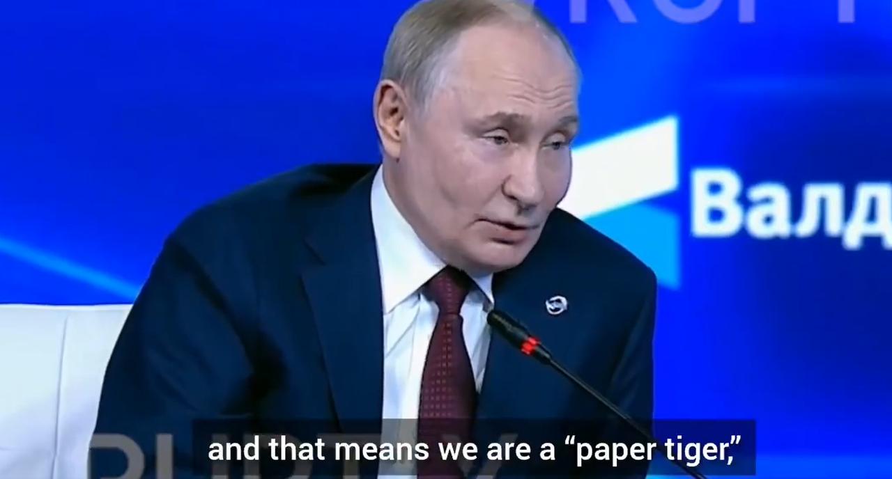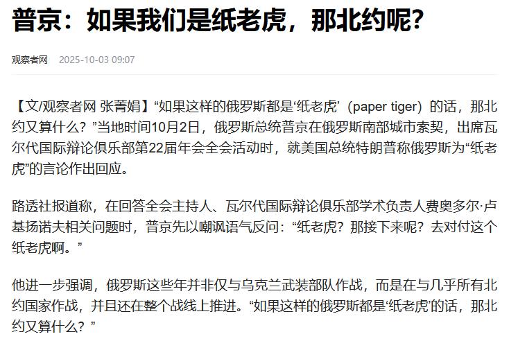普京回应俄被称纸老虎,仅用一句话就令现场哄堂大笑!   因为俄乌和谈迟迟无法推进,美国最近便开始耍起了嘴上功夫,形容俄罗斯“看上去是一只‘纸老虎’”,因为打了四年都没赢。   而就在10月2日的瓦尔代俱乐部年会上,面对美方的评价普京首次进行了公开回应,一句“要是俄罗斯对抗整个北约都算纸老虎,那北约算什么?纸老虎里的纸老虎?”   刚说完,现场嘉宾全笑了,而这看似简单的一句话,其实把当前国际局势里的关键问题说透了,美方只盯着“没赢”这个结果,却故意不提俄罗斯对面站着的是谁。   要知道北约可不是普通国家,它是目前全球最大的军事联盟,有几十个成员国。自从局势升级后,这些国家从各个方面给乌克兰搭把手:军事上送坦克、送导弹,情报上共享信息,经济上还提供援助,等于是把集体力量都投了进去。   这早就不是两个国家之间的较量了,而是俄罗斯在跟一整个军事集团掰手腕。   可就算这样,俄罗斯不仅没垮,还慢慢稳住了阵脚——能源上不靠别人,自己能产够;产业上也在调整,减少对外依赖,这些都不是“纸老虎”能扛下来的事。要是真没实力,面对这么大的压力,早就撑不住了。   普京这反问的巧妙之处,就在于用美方自己的逻辑反过来问。美方说“打四年没赢就是纸老虎”,那反过来想:北约集合了这么多国家的力量,有最先进的武器、最充足的资源,却连一个俄罗斯都压不住,没能占到绝对上风,那北约算什么呢?   这种不直接吵架、却能点透问题的方式,既幽默又有力,普京用一句话就把这种片面给戳破了,自然能引起共鸣。   其实国际上的事从来不是简单的“赢或输”就能说清的,尤其是这种复杂的地缘博弈,得看双方的真实处境。   俄罗斯这些年面对的压力可不小,西方的制裁一轮接一轮,军事上还要应对整个北约的支持,但它始终没乱了自己的节奏——该保障民生保障民生,该发展军事技术发展军事技术,这种战略定力背后是多年积累的国家底子,比如丰富的能源资源、完整的工业体系。   而普京的回应也不只是耍嘴皮子,更是基于对自身实力的清楚认识。他没说豪言壮语,就用一句反问让大家明白:评价一件事不能只看表面,得把所有背景都算进去,这样才客观。   也正是因为这话实在、有理,才让现场的人会心一笑,也让外界对当前的局势有了更全面的看法。