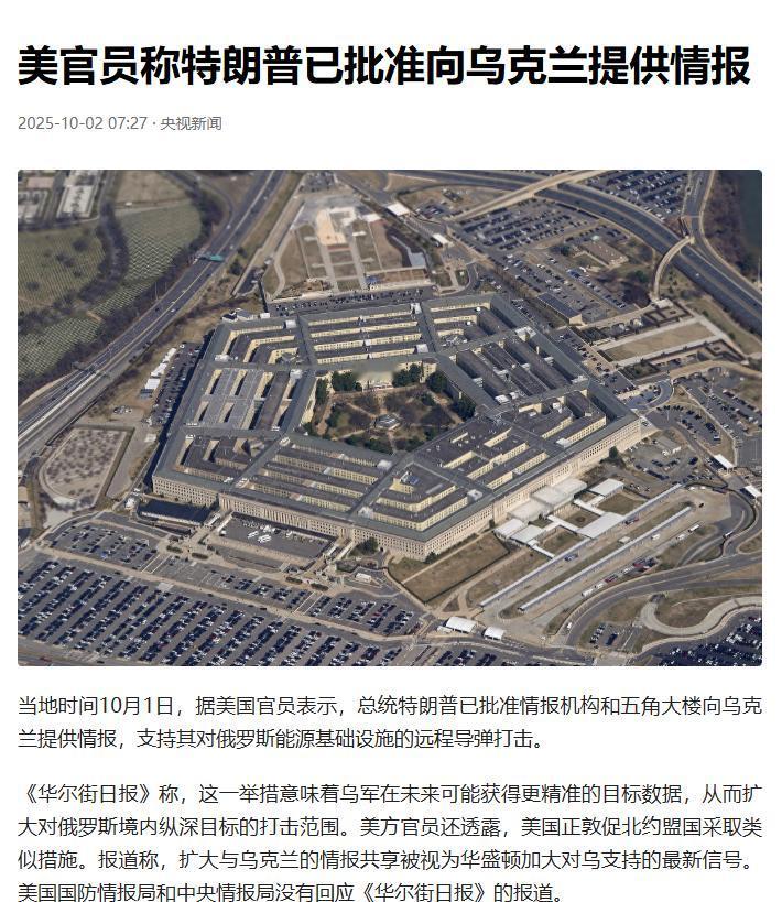 重磅!特朗普已经签署命令,决定将向乌克兰提供俄罗斯境内目标情报,美国媒体《华尔街日报》分析认为,这标志着美国对乌克兰的军援政策出现了重大转变,已经不再掩饰将协助乌克兰打击俄罗斯领土内目标,打破了拜登时期即便透露情报也不愿意承认的事实。 现在特朗普干脆把窗户纸捅破,明着喊“我就是要帮乌克兰打俄境内目标”。 更狠的还在后头。多家媒体早扒出,特朗普团队正琢磨给乌克兰送“战斧”巡航导弹。这玩意儿可不是闹着玩的,射程能超2000公里,莫斯科都在覆盖范围内。 美国副总统万斯都放话了,特朗普会做“符合美国最大利益”的决定。这话听着中立,实则已经把态度摆得明明白白。 乌克兰那边早盼着这一天了。泽连斯基直接跟美方谈900亿美元的军售协议,就盯着远程武器不放。他最近还夸特朗普态度“公正”,话里话外全是期待。 北约秘书长吕特也跟着敲边鼓,说普京“没打算结束战争”,加大施压才是逼他坐下来谈判的唯一办法。这等于给特朗普的举动递了梯子。 俄罗斯当然不会坐视不理。佩斯科夫立马站出来回应,说俄方正在仔细分析,得搞清楚将来谁指挥发射这些武器。他嘴上说“导弹不是灵丹妙药”,但行动上早让军事专家盯紧了局势。 俄媒也有自己的判断,说乌克兰现在缺发射“战斧”的舰艇,操作经验更是没有,真要用上还得美方培训。但即便如此,这种信号本身就足够刺耳。 要知道,这已经不是美国第一次深度介入了。早年前《华盛顿邮报》就曝过,美情报部门给乌克兰送实时卫星图、截获通信,堪称乌军行动的“关键推手”。 当时拜登还装模作样“不满”泄密,现在特朗普直接把暗棋摆到了明面上。这种转变背后全是算计。 特朗普去年竞选时还说要“快速解决俄乌冲突”,结果上台大半年没进展。现在突然加码,说白了就是想靠极限施压逼普京让步。 他的算盘打得很精:先给情报让乌克兰精准打击俄能源设施,比如炼油厂、输油管道这些命脉。紧接着再把“战斧”这类大杀器送过去,形成双重威慑。 这一套组合拳下来,就是要跟普京摊牌:要么按美国的意思跟乌克兰谈判停火,要么等着局势进一步升级。 特朗普的警告里藏着更狠的后手。要是普京不接招,他说不定真会松口,让北约成员国部队直接或间接介入。这步棋一旦走出来,冲突的规模就彻底没边了。 国际社会看得直皱眉。半岛电视台的专家早说过,美国这么做是“在危险的道路上狂奔”,俄方只会把这当成直接进攻。 《纽约时报》专栏作家托马斯·弗里德曼更直白,骂这种高调介入“极其愚蠢”,冲突拖得越久,美国越可能栽大跟头。 意大利教授科斯塔点破了本质:美国哪是为了乌克兰的自由,根本是想靠这场冲突主导全球秩序。这话算是说到了根子上。 现在的局势就像堆着干柴的火场。特朗普递过去的情报和导弹承诺,就是一根明晃晃的火柴。 乌克兰拿到情报,打击精度会直线上升,俄境内纵深目标的风险陡增。真等“战斧”到位,战场的边界会彻底模糊。 俄方的回应也不会手软。佩斯科夫说了,会根据实际情况定应对措施,俄防空系统早有拦截“海马斯”的经验,对付“战斧”大概率也有预案。 但不管拦截效果如何,冲突升级的潘多拉魔盒算是被特朗普撬开了。以前还局限在乌东战场,现在直接把战火引线拉到了俄本土门口。 更值得琢磨的是,美国还在撺掇北约盟国跟着干。特朗普政府已经放话,要求盟友也给乌克兰提供类似情报支持。 这等于要把整个北约绑上战车。一旦盟友跟进,俄罗斯面对的就不只是乌克兰,而是整个西方阵营的情报和武器合力。 泽连斯基倒是信心十足,反复说不会在领土问题上让步。但他没说的是,乌克兰正在变成大国博弈的棋盘,自己能做的选择其实少得可怜。 普京那边也没关谈判的门,还等着特朗普来莫斯科会晤。但特朗普这波操作下来,谈判的筹码和底线早就变了味。 说到底,特朗普这招是典型的“极限施压”套路。用情报铺路,用导弹加码,逼着俄罗斯在谈判桌上低头。 信源:新华社华盛顿10月1日电,《美媒:美将为乌远程袭击俄能源设施提供情报》