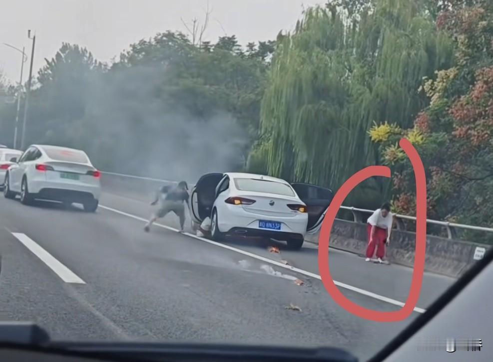 一白色车子行程途中底盘突然冒烟起火,后车鸣警提醒,比车主还着急。最终幸运脱险。网友:为什么不先抱孩子? 一位网友发现了前车底盘着火冒烟,疯狂鸣笛提醒,比车主还着急。车主也发现情况后,立即把车子停到了应急车道,司机下车查看后,立即从底盘拉出了着火的长条物,但火情依然存在,男子从后备箱找到了灭火器,对底盘进行灭火。而从右边下车的女子吓得手足无措,一时间不知道该干什么,她左右跑动,最后才想起来孩子还在车上。 在男子从底盘上拉出着火物品时,网友推断应该是行驶过程中,塑料布或易燃物挂排气管了,高温导致燃烧。 有不少网友发出疑问,为什么第一时间不是抱孩子,而是下车穿鞋!万一火势蔓延迅速,那后果不堪设想。 幸亏好心人的提醒,迅速把火灭掉了,也提醒着我们一定要在汽车的后备箱配备灭火器。如果发现着火,也一定要第一时间把所有人员都疏散下来。