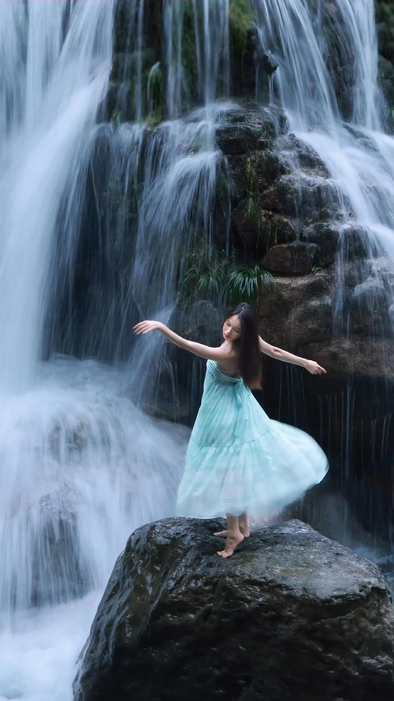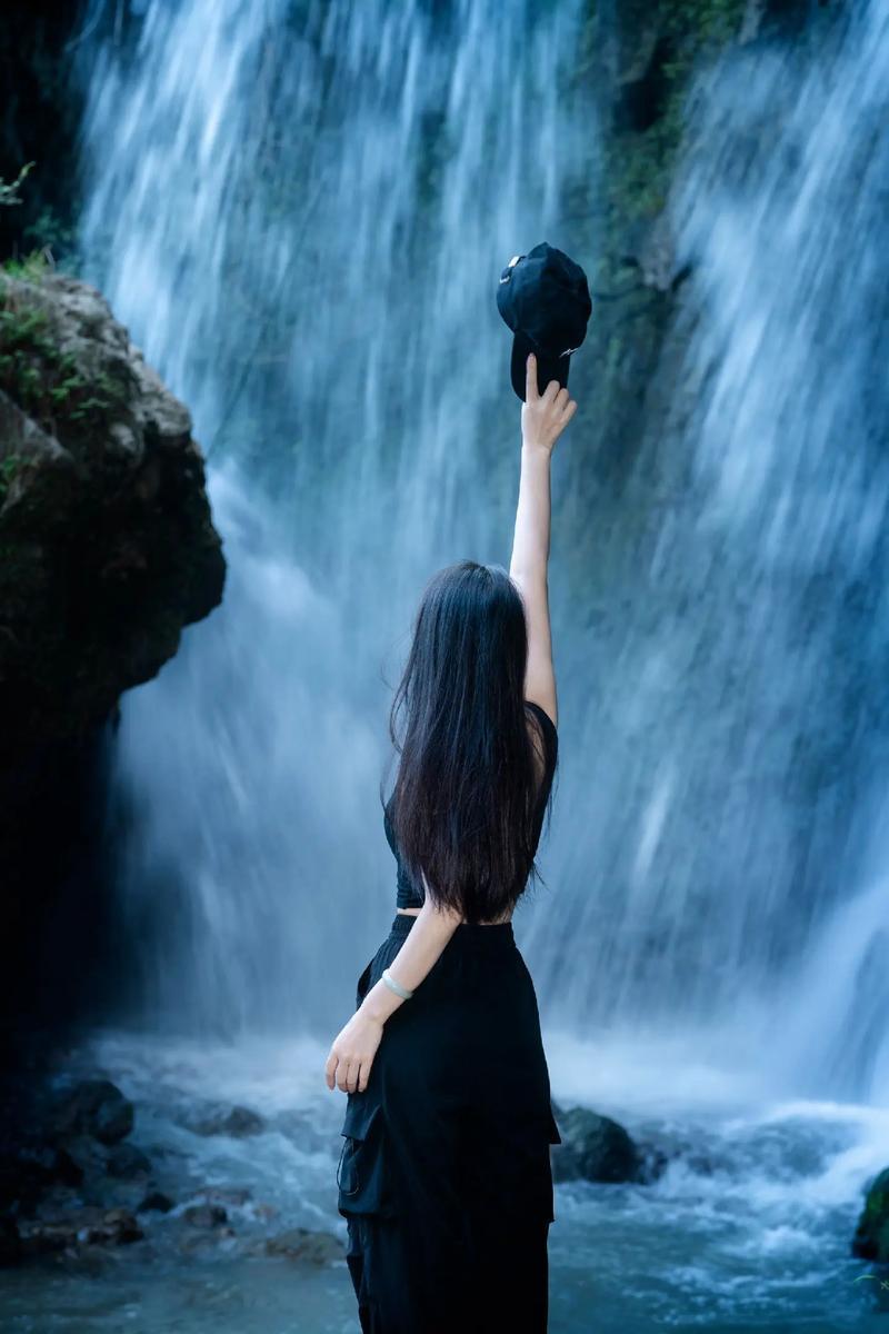 瀑布前的奇妙“邂逅” 女生站在瀑布前,正欲定格这水花飞溅、如梦似幻的瞬间。快门