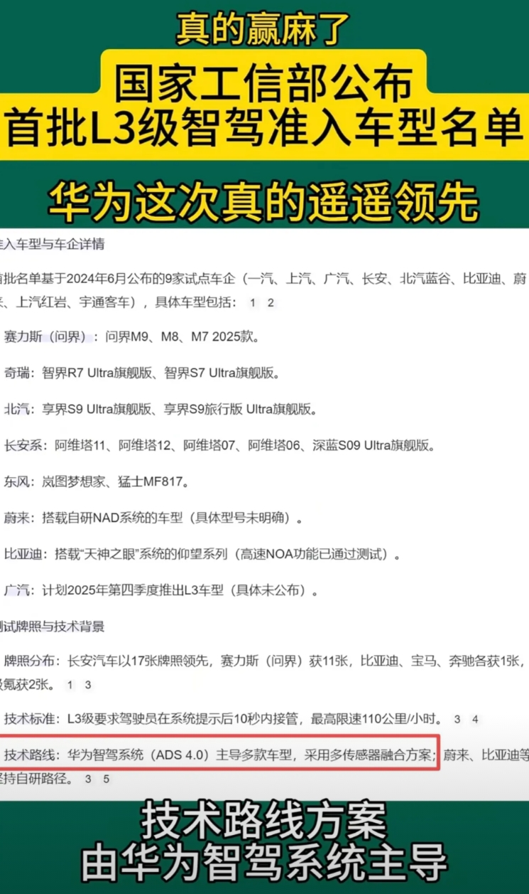 这次不必麻烦余承东说遥遥领先。国家工信部公布首批L3级智驾准入车型名单,华为五界