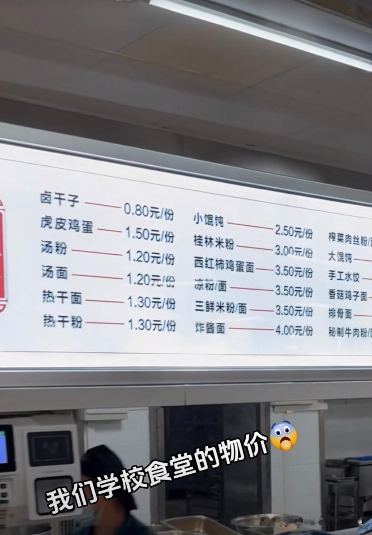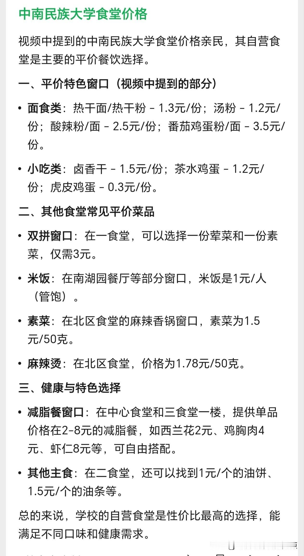 大学食堂价格为什么可以这么低? 你为什么不在我上大学前告诉我。 中南民族大学这食堂价格一发出来感觉天都塌了。 后悔自己知道的太晚了。 所谓的热干粉,热干面只要只要1.3元 虎皮鸡蛋3毛。茶水鸡蛋1.2元 一荤一素也只要仅需3元,米饭是1元/人(管饱)。 ·素菜:在北区食堂的麻辣香锅窗口,素菜为1.5 元/50克。 ·麻辣烫:在北区食堂,价格为1.78元/50克。 如果要喜欢健康点的,2-8元的减脂餐,如西兰花2元、鸡胸肉4 元、虾仁8元等,可自由搭配。