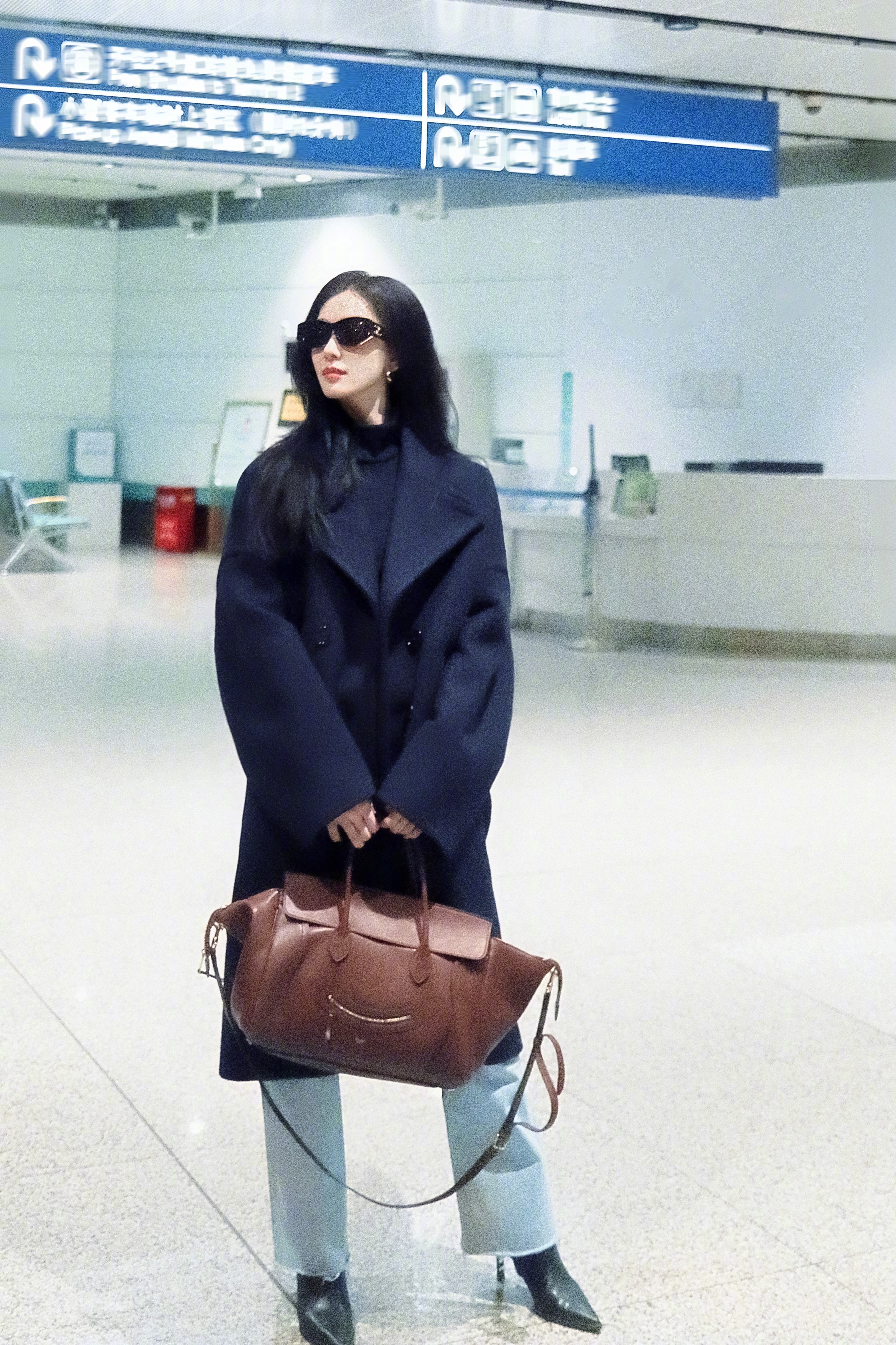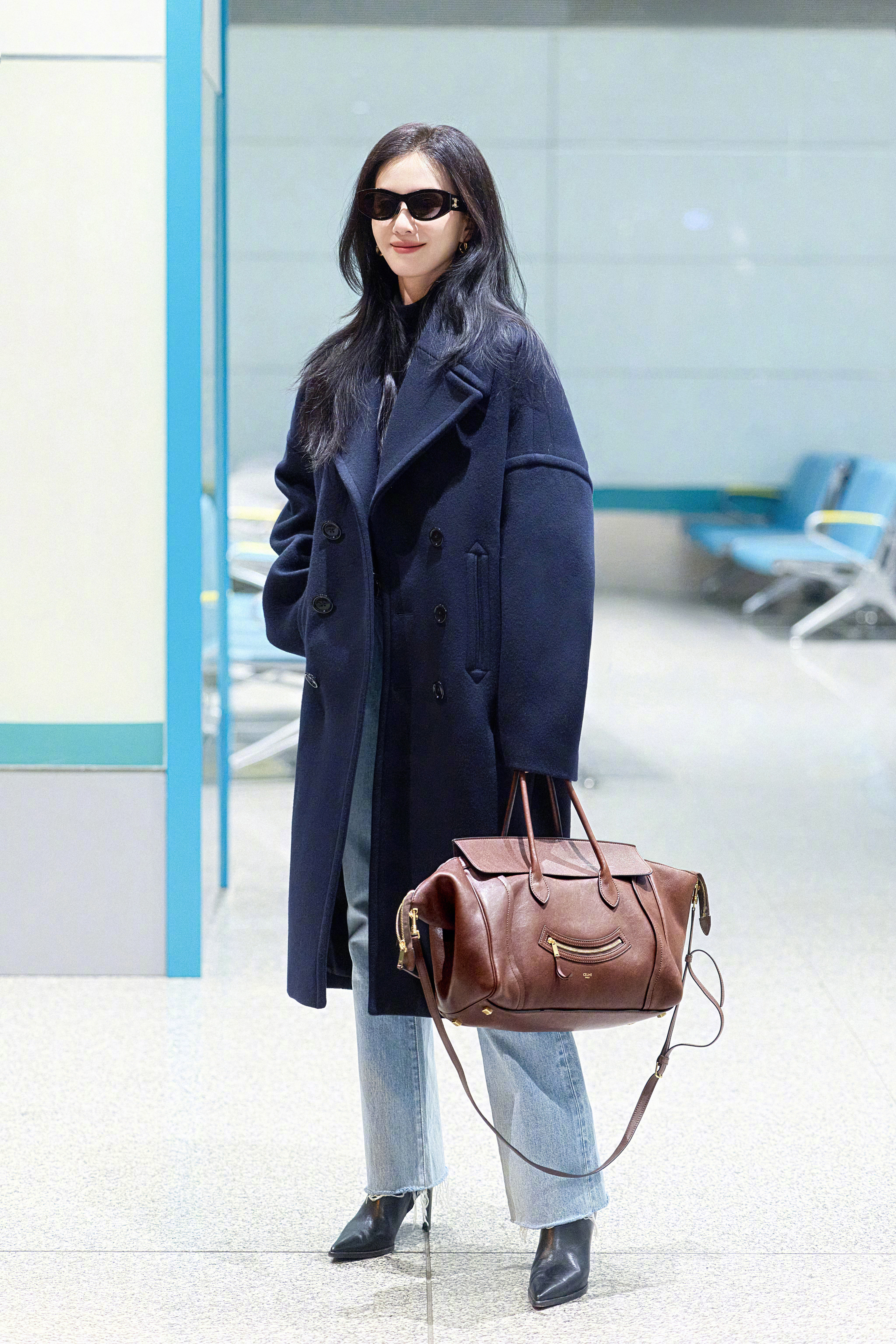 刘诗诗身穿Celine海军蓝大衣和喇叭牛仔裤👖,配搭TRIOMPHE15太阳