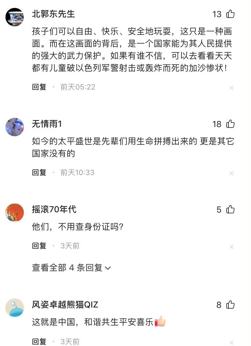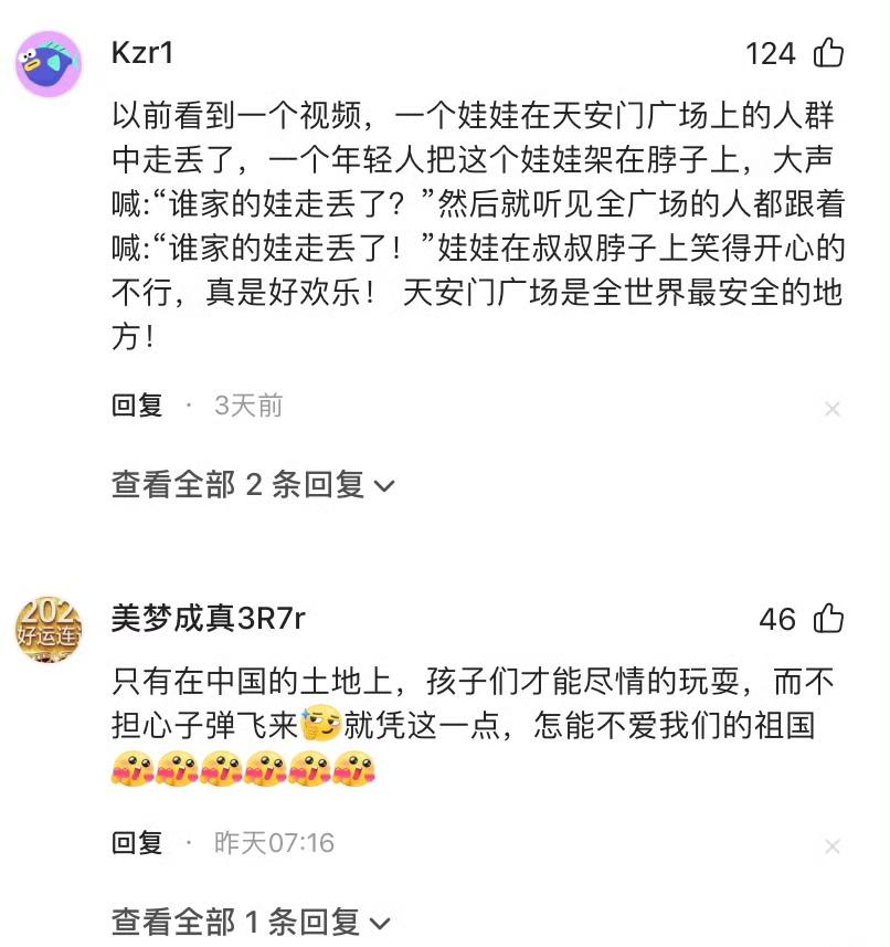 俩外国幼崽正在北京天安门广场玩耍,此时两名武警战士迈着稳健的步伐从他们身旁经过。晴朗的天空下,威武的战士、壮观的天安门广场与活泼的孩子相映成趣,整个画面洋溢着安宁与和谐的氛围,格外动人。