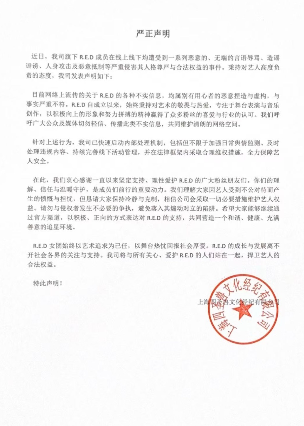 针对R.E.D遭受恶意攻击及不实信息困扰,公司发布声明,将维护艺人权益,保障艺人安全。