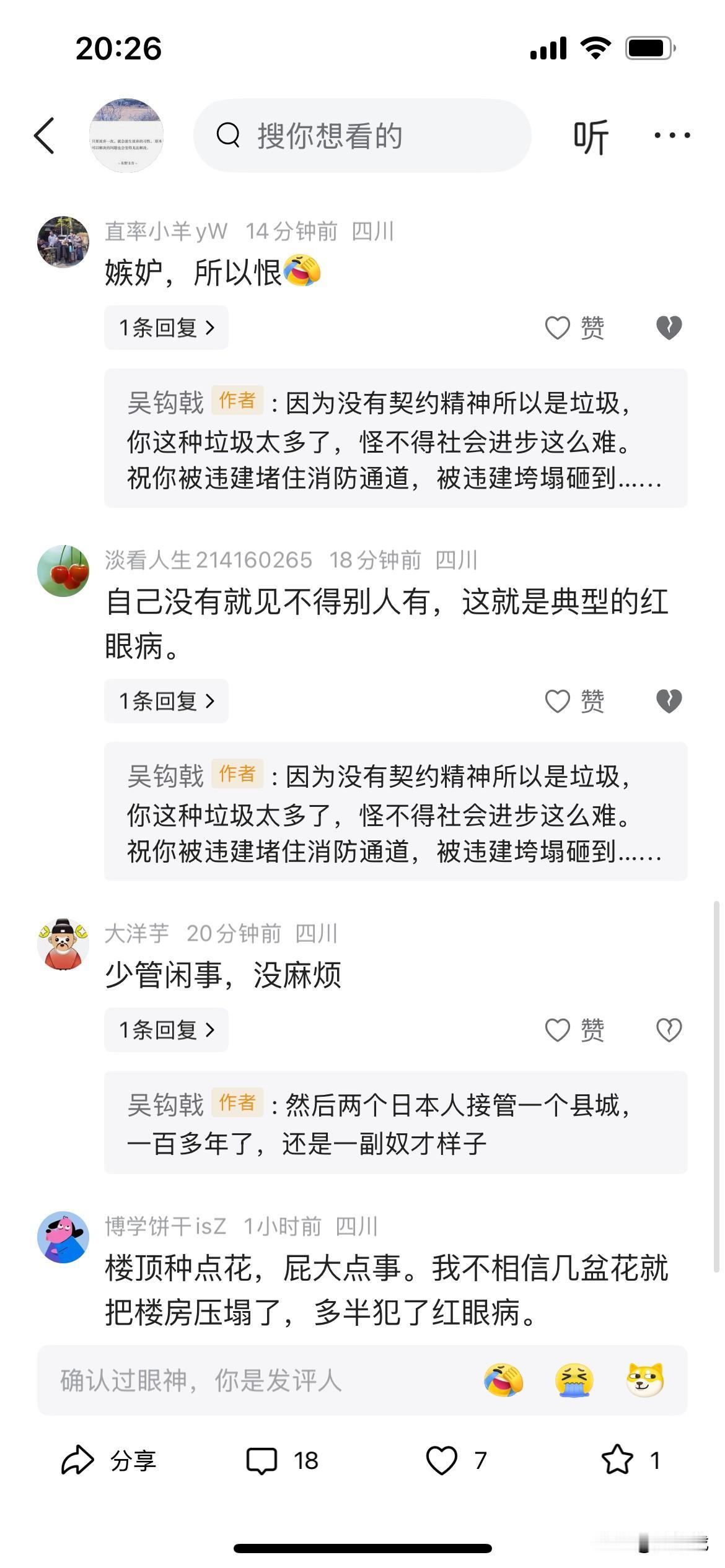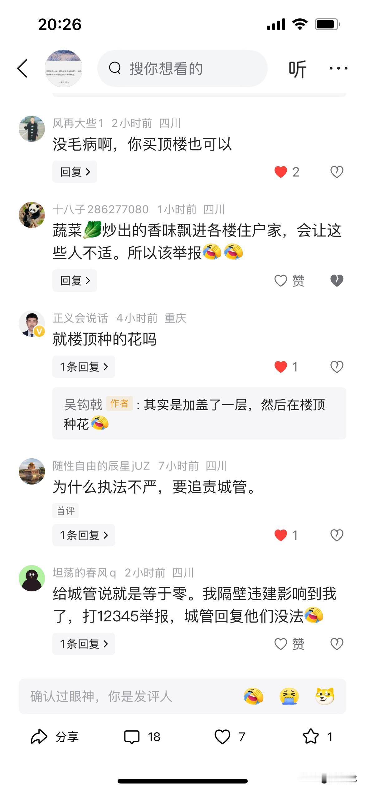 发了一个帖子痛斥小区违建,结果大家都说你的红眼病[捂脸]几乎是清一色的,难道让大家养成契约精神这么难吗?顶楼加盖一层,大家觉得正常,二楼把单元门大门顶打通,安装顶篷,变成自己的私人空间,然后这帮垃圾一边倒的说你是红眼病[狗头]我终于明白了为什么武汉大学,川大……这些是非已经很分明的事声张正义却是如此困难了……无他,垃圾太多