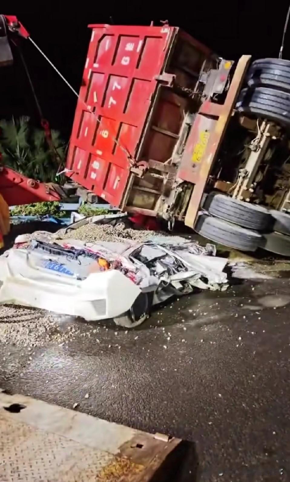 国庆惊魂!小车被压扁了! 国庆夜的高速上,一辆大货车侧翻,把旁边的小车直接“