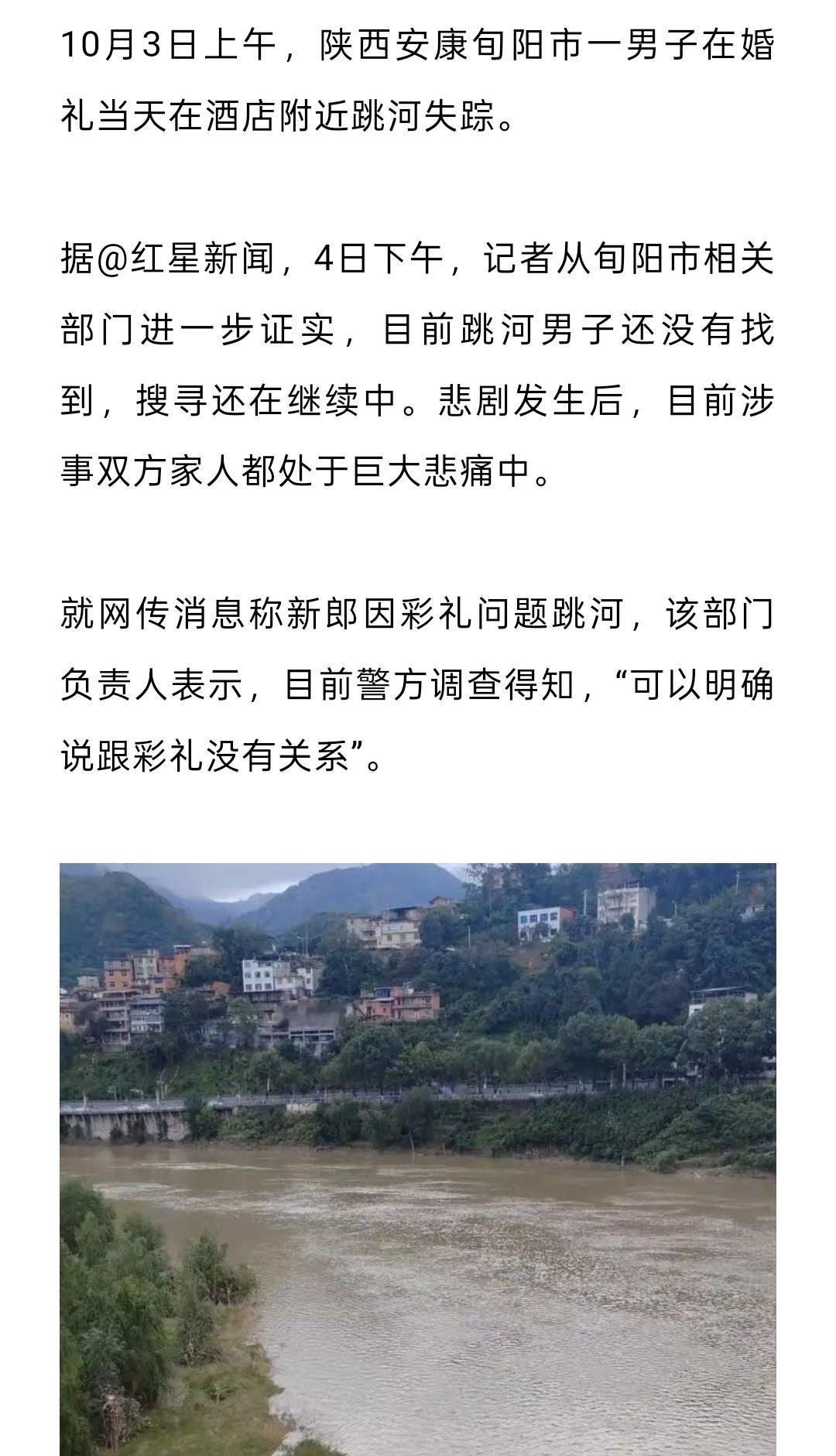 安康旬阳,男子婚礼当天跳河,官方最新回应 可以明确跟彩礼没关系;目前跳河男子还