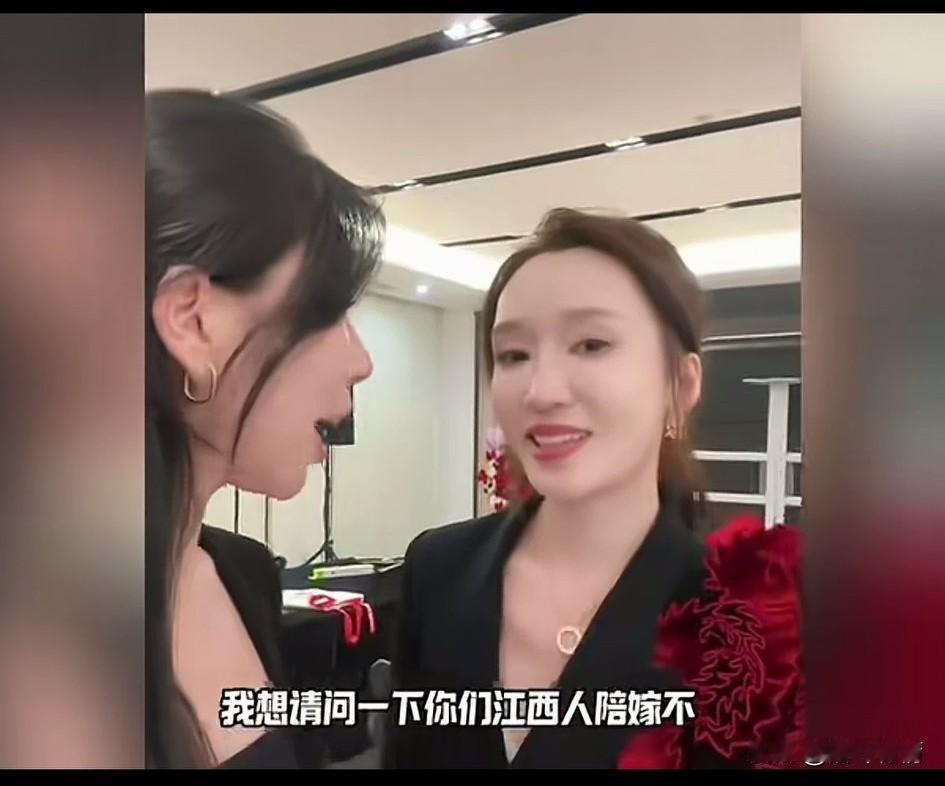 两位美女主播讨论江西天价彩礼, 黑衣女子是福建人, 红衣女子是江西人, 黑衣女子