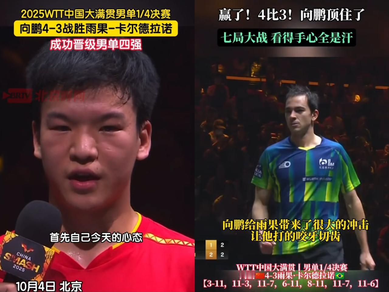 雨果这次真可惜, 止步四强, 3-4输给了向鹏,估计 赛后他心里得有这4句