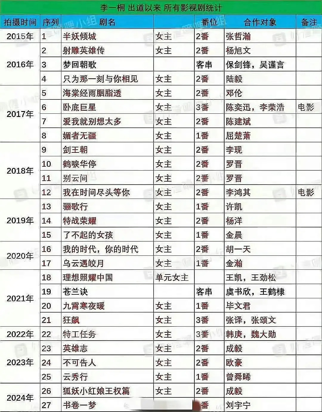 李一桐出道至今27部戏,25部女主