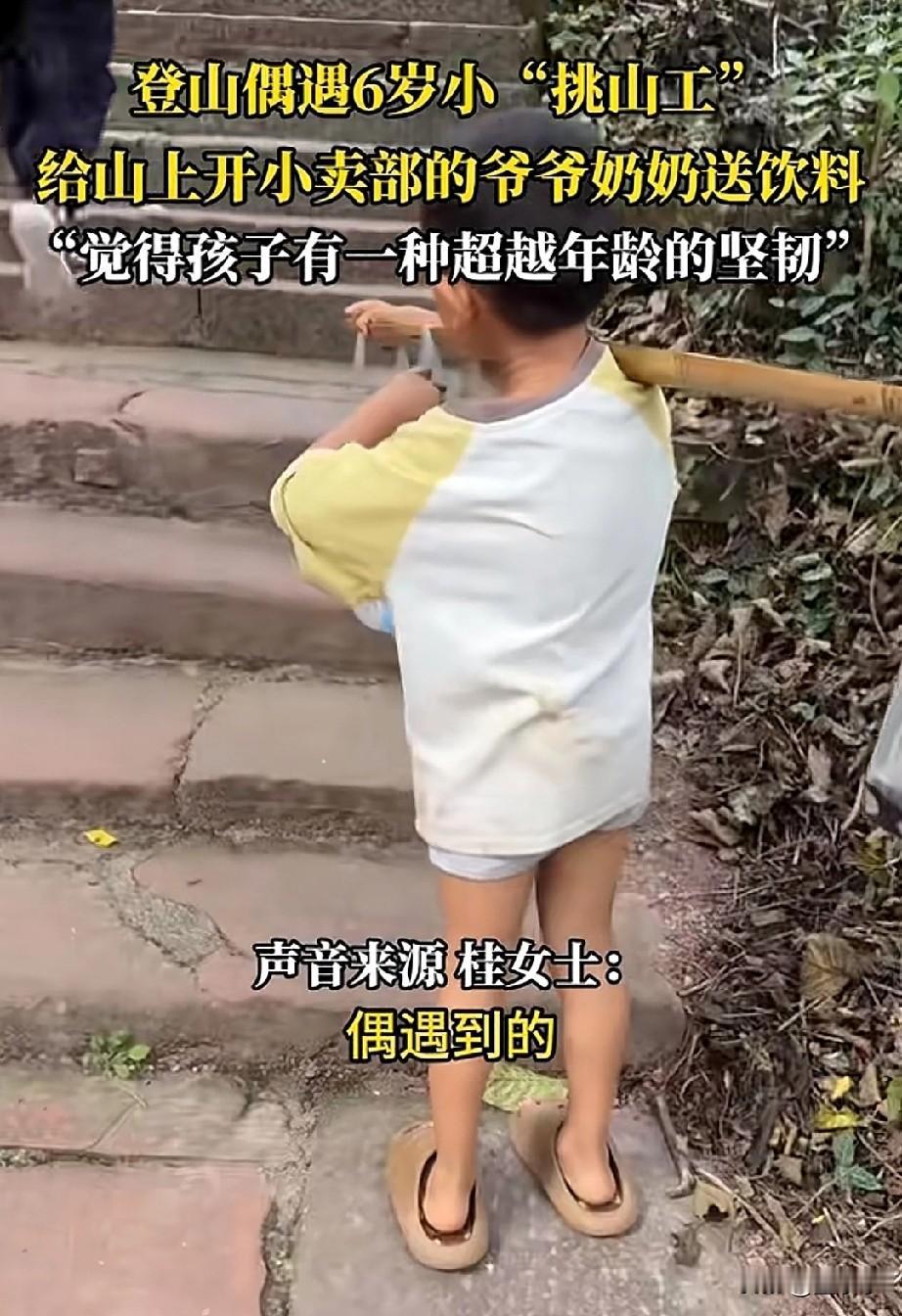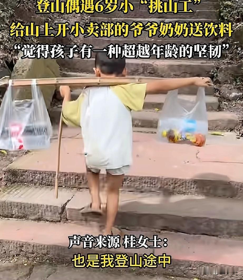 都说穷人家的孩子早当家,一位桂女士国庆在登齐云山的时候,偶遇到一位6岁的孩子,挑着饮料往山上走,待询问后才知道,孩子是给在山上的爷爷送货过去。 孩子的这份坚韧也让桂女士大吃一惊,这么小不嫌累,不辛苦,一步一步的挑着饮料往山上走,真不简单。 要知道就算你一个成年人两手空空的爬山,都会被累的不行吧,何况他还是一个孩子。