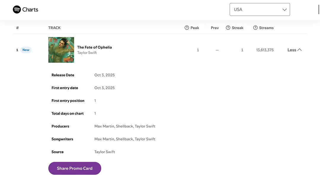 霉霉刷新全球单曲首日播放纪录 霉霉Taylor Swift全新单曲《The Fate of Ophelia》首日以3098.7万串流收听次数空降Spotify全球日榜第1位,美区以1361.3万串流收听次数空降日榜第1位,打破双榜史上最高单日播放纪录📊