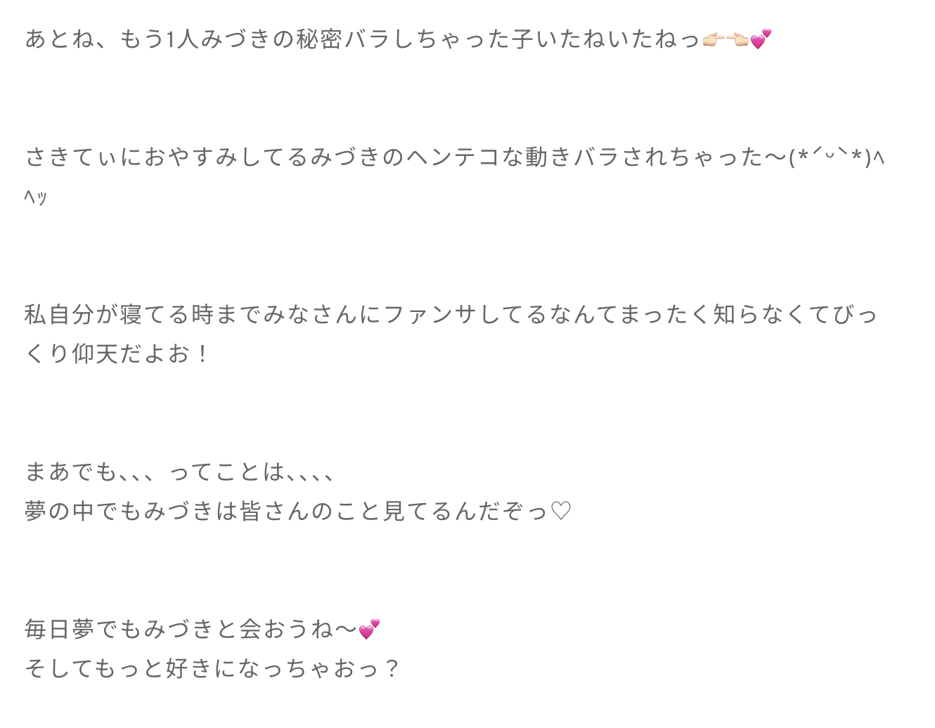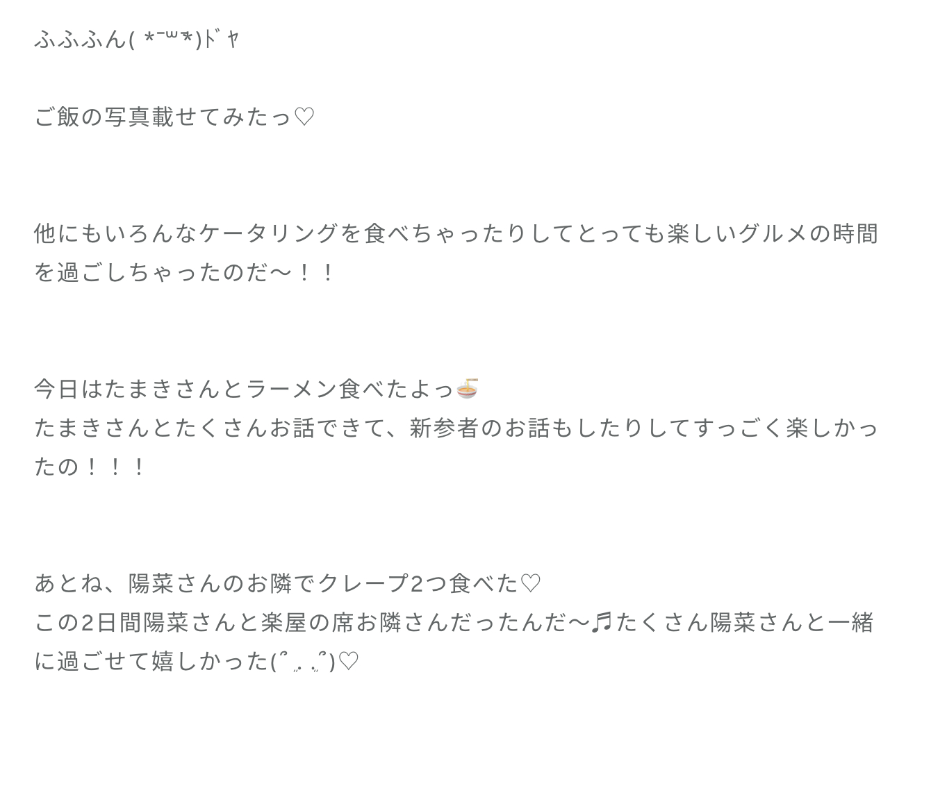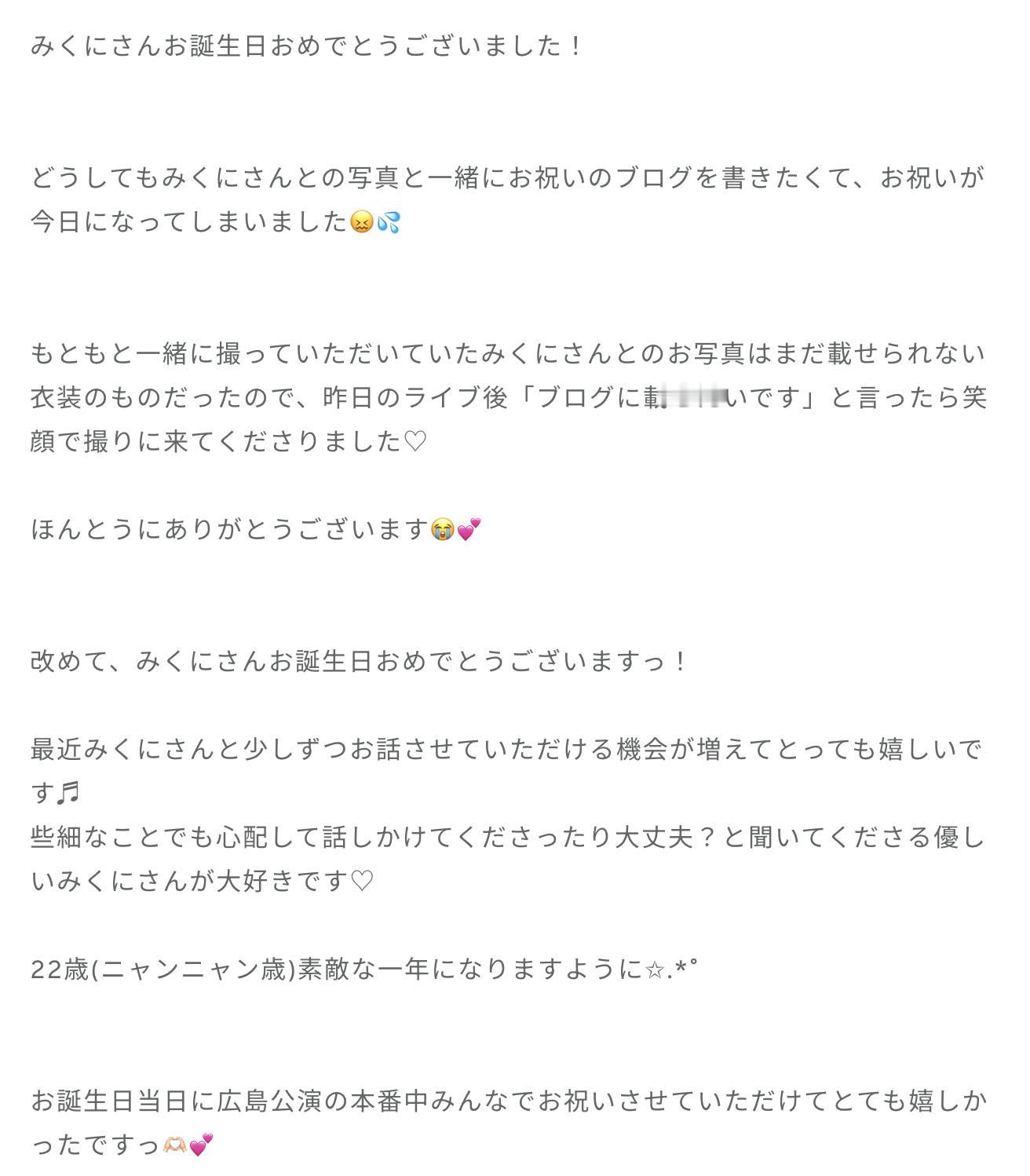 大田美月「初めての福岡公演ほんとにほんとに楽しくて一瞬で時間が過ぎていってしまって寂しい気持ちもある…!でもでも、次の愛知公演に向けてもっと良いものをお届けできるように日々頑張りますので、また来て下さると嬉しいですっ!とにかくとにかく福岡楽しかったよーっ!また福岡来たいなぁ♡みーちゃんね、おひさまのみなさんのこと好いとーよっ♡」