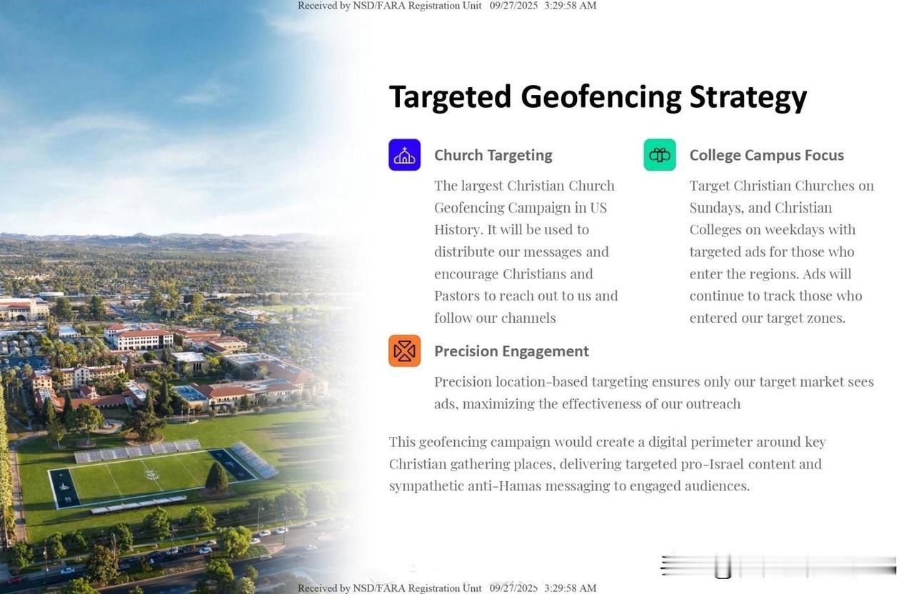 揭露文:以色列斥资410万美元,通过虚拟现实和地理围栏宣传活动对美国基督徒进行洗脑 新的《外国代理人登记法》文件揭露了以色列针对美国基督徒开展的大规模宣传活动。 以色列政府向保守派活动家查德·施尼格的公司支付高达410万美元,以开展美国历史上规模最大的教会地理围栏活动,向基督教教堂和大学大量投放亲以色列、反巴勒斯坦的广告,这些广告会追踪参与者的手机。 一个名为“10月7日体验”的品牌拖车将在美国巡回展出,邀请人们戴上虚拟现实头显,观看哈马斯袭击的沉浸式模拟场景,这是“幸存讲述/成为见证者”计划的一部分。该活动由好莱坞布景师设计,并融入了圣经意象。 文件还披露了以下计划: · 雇佣社交媒体影响者进行“正面报道” · 招募牧师撰写亲以色列的专栏文章 · 在教堂和校园持续开展地理围栏数字广告活动 · 在社交媒体上充斥经搜索引擎优化的反巴勒斯坦信息 宣传幻灯片指示外联团队强调,巴勒斯坦人“从未有过国家”、“选举哈马斯”、“庇护恐怖分子”,并且代表着“激进伊斯兰恐怖主义”。 **地理围栏是一种数字营销和监控技术,它在特定物理位置(例如教堂、大学校园或抗议地点)周围设置虚拟边界(或“围栏”)。** 当有人携带智能手机进入该地理围栏区域时,其设备可通过定位服务、移动广告标识符或应用程序数据被识别和标记。一旦被标记,此人可能会: · 在围栏内时以及之后移动或上网时,收到定向广告(例如亲以色列、反巴勒斯坦的信息)。 · 被长期追踪:活动可以在设备离开后继续追踪,在数周或数月内持续推送定制广告。 · 被建档以进行进一步的外联或数据分析,而用户往往对此毫不知情。 这不是一场私人公关活动,它由以色列政府资助,并根据《外国代理人登记法》进行了登记。一个外国政府正花费数百万美元,利用军用级别的心理作战技术来影响美国基督徒的观点。 #巴以冲突##哈马斯称准备立即就加沙停火协议进行谈判##热点观点#