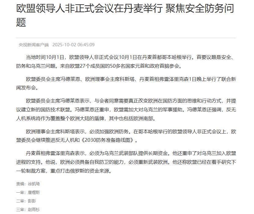 10月2日,欧盟27国10月1日在丹麦哥本哈根刚开完非正式会议,欧盟27个成员国50多名国家元首和政府首脑参会 ,主要商量了三件大事:怎么保护欧洲自己的安全、怎么发展防务,以及怎么继续支援乌克兰! 这阵仗不是小题大做。丹麦政府早早就禁了全国民用无人机飞行,谁都清楚,如今欧洲的安全议题早已容不得半点马虎。会议刚开场,各国领导人就达成了共识,欧洲的国防思维必须彻底转变。 欧盟委员会主席冯德莱恩说得很直接,得建个新的国防技术联盟,反无人机系统要变成覆盖全欧洲的盾牌,连南部地区都不能落下。这话戳中了很多国家的心思,毕竟近期不明无人机频频现身的阴影还没散去。 但共识之下全是暗礁。法国一直喊着“欧洲安全由欧洲做主”,想把防务自主牢牢抓在手里。德国却偏要在北约框架下搞防务一体化,连买战机都盯着美国的F-35。这俩欧盟“主心骨”的分歧,早就在对乌援助问题上摆到了台面上。 马克龙之前提过向乌克兰派兵的可能,朔尔茨当场就拆台,说那只是他个人态度,德国军队绝不去乌克兰。到了哥本哈根,俩人虽没直接呛声,但立场差异摆得明明白白。 钱的问题更现实。欧洲经济还没从疲软里爬出来,各国却要砸钱搞武器采购、建设施。德国虽设了1000亿欧元的专项基金,可其他国家看着缩水的财政报表,根本硬气不起来。 乌克兰议题成了矛盾的催化剂。丹麦首相弗雷泽里克森一开口就把话挑明,必须给乌克兰武装部队搞长期资金,还得推进他们的入盟进程。冯德莱恩也跟着加码,反复强调要加大军事援助。 可援助的底气在哪?德国对乌援助早超177亿欧元,法国才6.4亿欧元,这种差距让分歧更难弥合。更棘手的是,欧盟还在琢磨下一轮对俄制裁,想盯着俄罗斯的资金来源下手,可谁都知道,制裁的反噬效应从来不会缺席。 欧洲理事会主席科斯塔试图拉回焦点,他反复提《2030防务准备路线图》,想让各国把目光放在长远规划上。但现实是,各国执政党自身都难保:德国朔尔茨政府支持率跌到30%,法国政府被反对党围着怼,英国保守党刚丢了执政地位。 右翼思潮抬头更让事情雪上加霜。有些国家的防务战略都开始往回缩,谁还有心思全力推进合作?法德之间的“主导权”之争更没停过,法国想引领军事方向,德国却要把经济实力变成军事影响力,以前的“双引擎”快成了“互相拽后腿”。 美国的影子也没离开会场。它盼着欧洲多砸军费,却绝不肯让欧洲真的脱离掌控,一边扩大防务合作,一边悄悄强化军事部署。这种“既给糖又套绳”的操作,让欧洲的防务自主成了个尴尬的笑话。 会议开到晚上,冯德莱恩、科斯塔和弗雷泽里克森一起开了新闻发布会。三人说着“加强防务”“支援乌克兰”的官话,可眼神里的疲惫藏不住。他们都清楚,这场会议没找到标准答案。 反无人机系统的部署能落地吗?国防技术联盟怎么协调法德分歧?乌克兰的长期资金从哪来?这些问题像没解的方程,扔给了会后的欧洲。 说到底,哥本哈根的会议更像一场“集体焦虑释放”。欧洲一边喊着要自主,一边离不开北约;一边想支援乌克兰,一边算着经济账;一边要抱团取暖,一边又各怀心思。 那些摆在台面上的共识,终究要面对现实的拷问。没有真正的步调一致,没有扎实的资金支撑,再响亮的口号也扛不住安全挑战的冲击。欧洲想在安全迷局里找到出路,恐怕比协调27国的立场还要难。 信源:新华网《法德瑞向丹麦派遣军事人员协助安保》