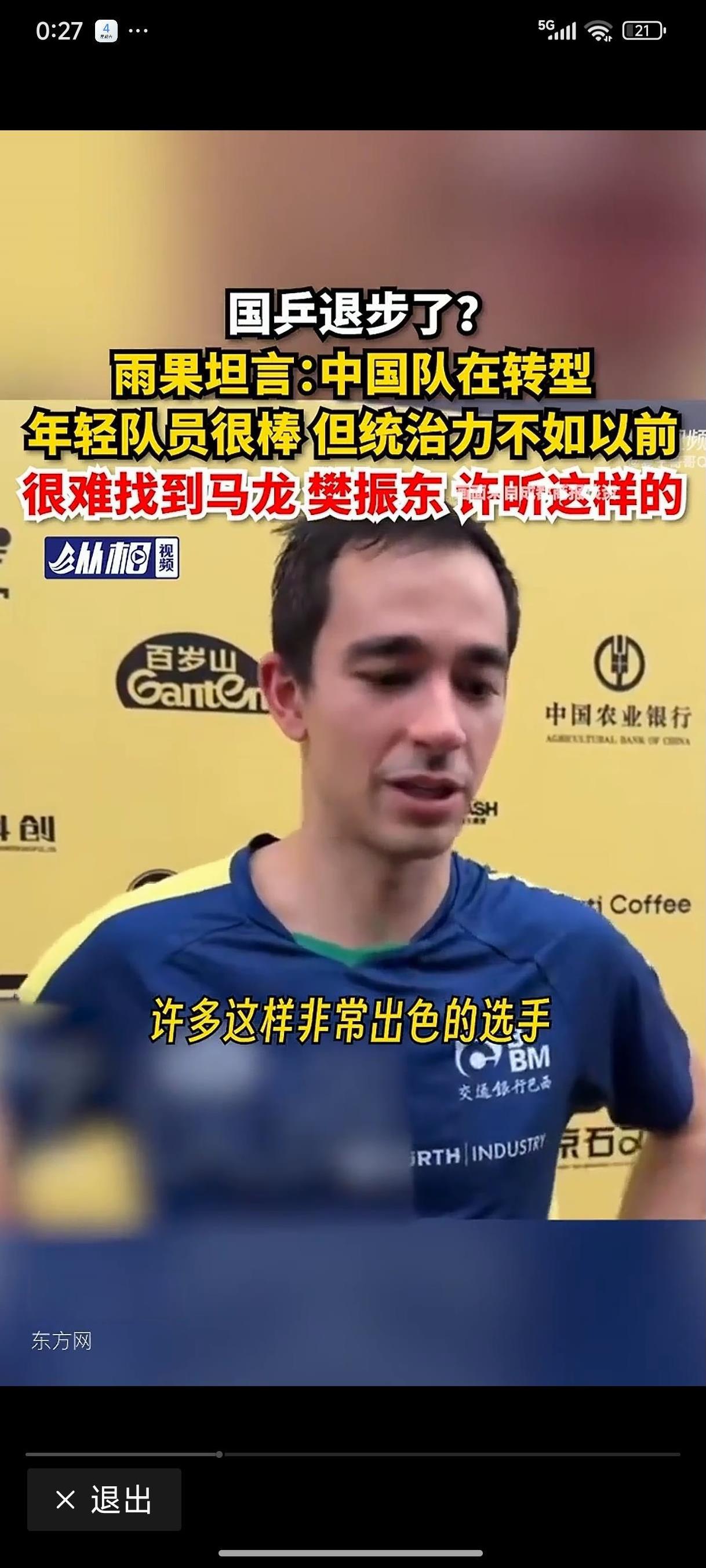 雨果这名运动员是一个坦率的人,从他在赛后接受采访时说出了国乒目前的现状,他坦言:国乒目前似乎处在一个转型期,年轻球员很棒,但缺乏统治力,很难再找到像马龙、樊振东、许欣这样具有统治力的球员。很多人对这段采访提出了质疑,表示不认可,而我恰恰相反,我觉得雨果其实说出了实话,应该为他的坦率点赞[赞],我们国乒目前只有王楚钦还算比较稳定,其余选手目前真的不具备统治力,这是事实,我们要虚心接受人家的看法,大家觉得如何?