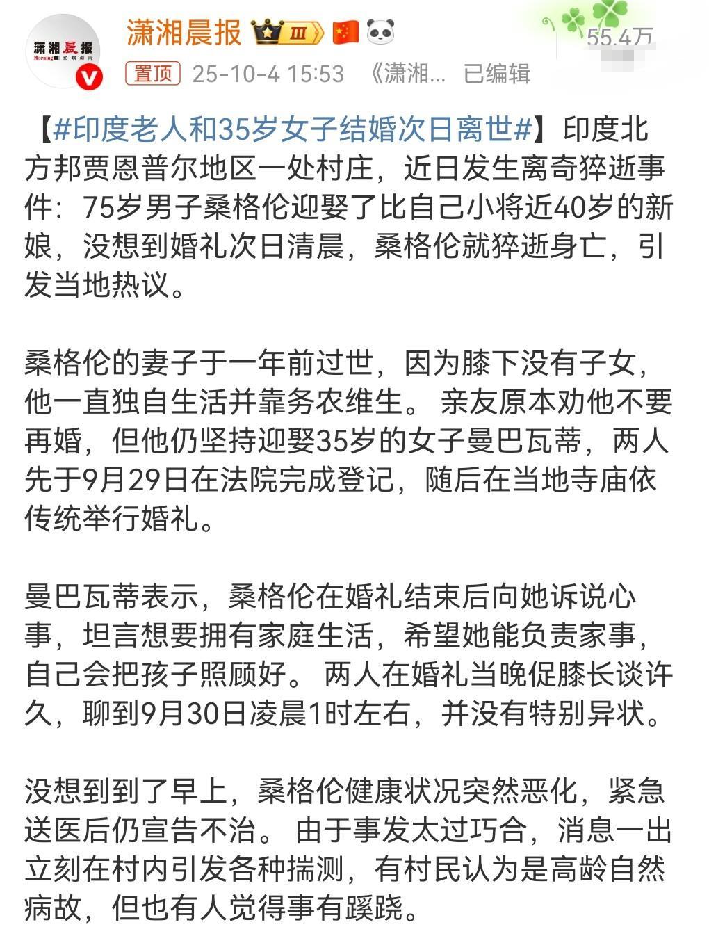这真是太悲剧了。结婚本来是一件大喜的事,近日,印度75岁老人和35岁女子结婚,次日离世。 男子有5000平米土地,女方有三个孩子。 这女人为了孩子不得不嫁给这样的老人。 是脑溢血死的,警方排除他杀。 想不到印度曾经出现过106岁娶35岁的女子育有4子的极端案例。 这应该是为财产而来。 #印度老人和35岁女子结婚次日离世#