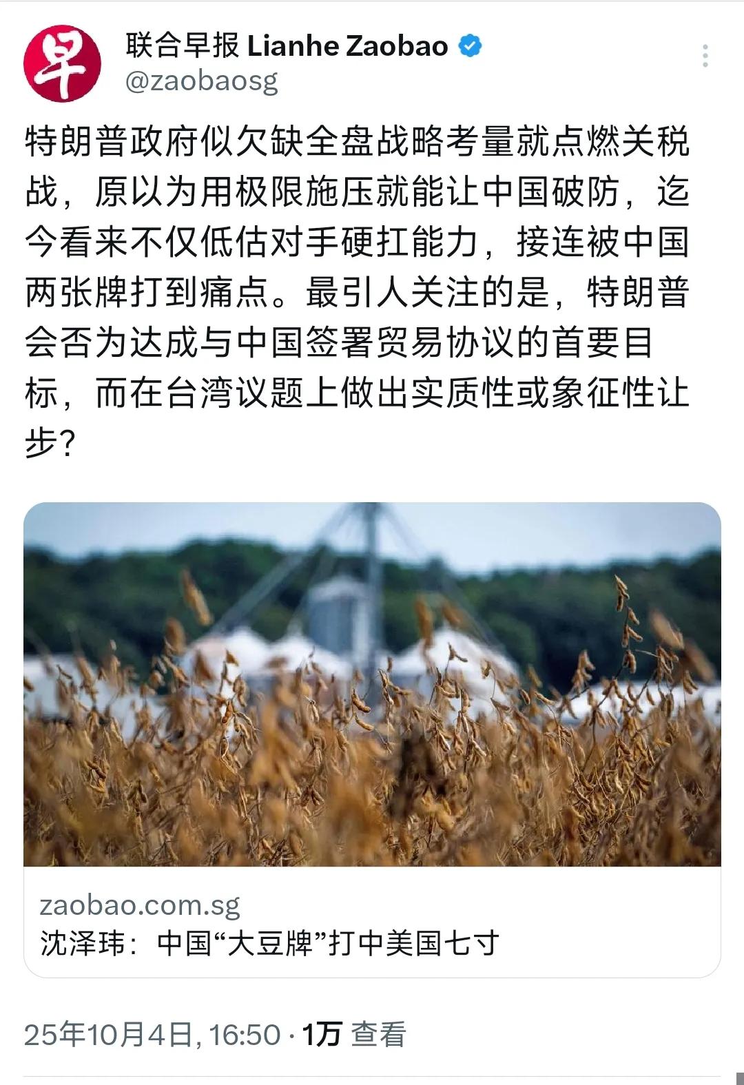 新加坡联合早报10月4日该报中国新闻副主任沈伟泽:“特朗普政府似欠缺全盘战略考量就点燃关税战,原以为用极限施压就能让中国破防,迄今看来不仅低估对手硬扛能力,接连被中国两张牌打到痛点。最引人关注的是,特朗普会否为达成与中国签署贸易协议的首要目标,而在台湾议题上做出实质性或象征性让步?” 这个外国媒体和这个沈伟泽明批特朗普考虑不周,实则是恨铁不成钢,痛心疾首,同时也是在为他支招,暗示其把台湾问题当成贸易谈判的重要筹码,绝不可在台湾问题退让,一错再错。太坏。 一个前总理能卑微地接受日本授勋的国家、也是美国盟友的国家,最不愿意看到的就是在中美博弈中获胜的一方是中国,就像现在看的,当中美之间发生重大利益冲突或者战争时,它会自动地成为美国的帮凶。 但这个国家和这个沈伟泽忘了,新加坡只是一个在大象打架时会随时被踩死的蚂蚁,成为中美博弈中被美国弃用或送出的牺牲品,如果它不懂得躲避和远离,而是不自量力地把自己当成重要的参与者参与到中美两国博弈中,它落下被踩死的下场一点都不奇怪。